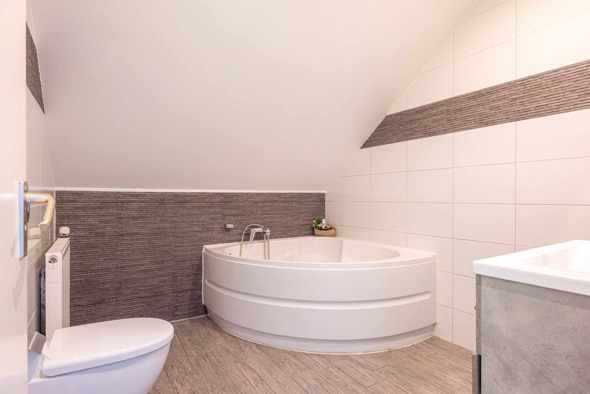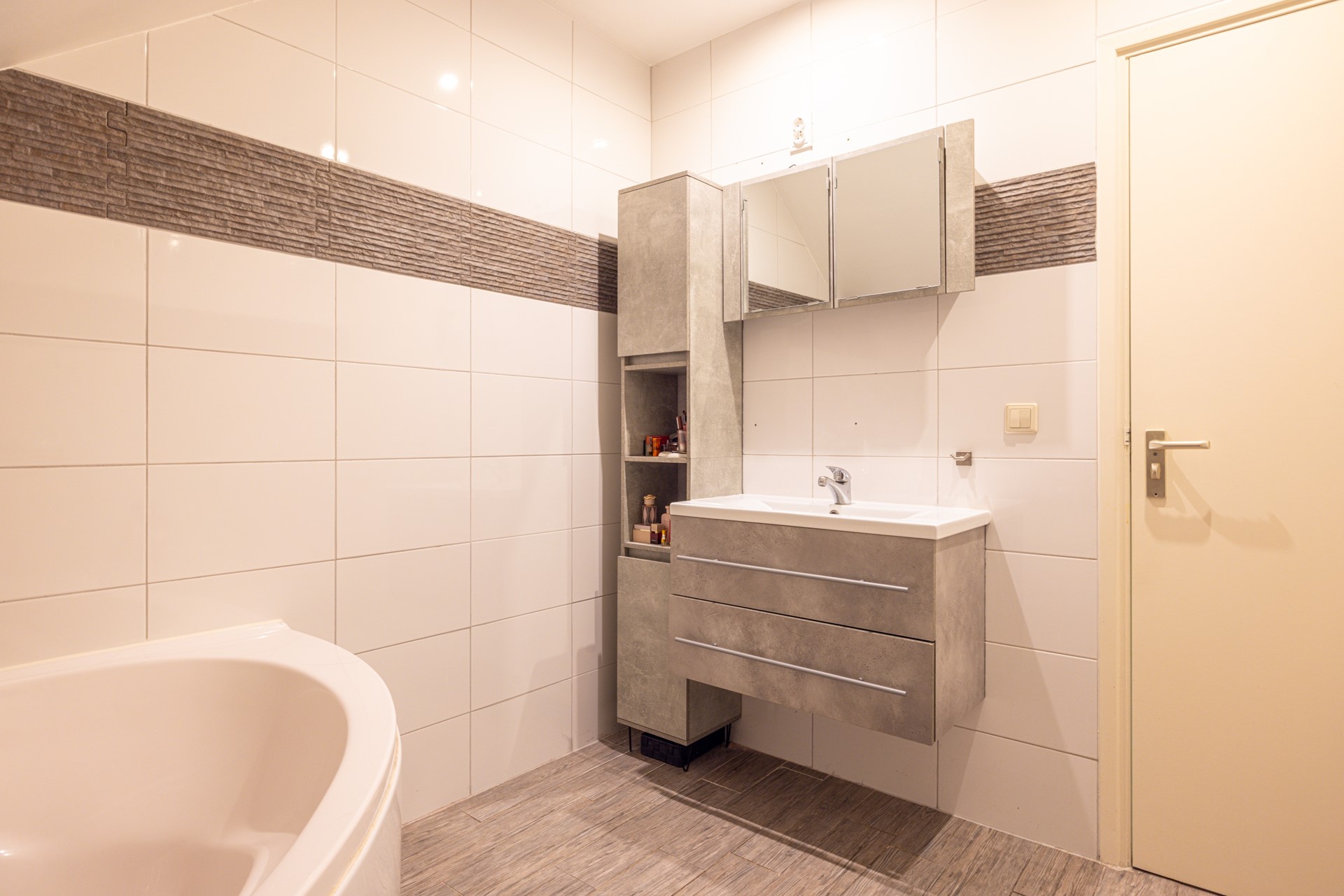 De badkamer is verzorgd uitgevoerd met een tegelvloer en ingericht met een ligbad, zwevend toilet, wastafelmeubel met spiegel en een radiator, waardoor deze verdieping volledig geschikt is voor dagelijks gebruik.