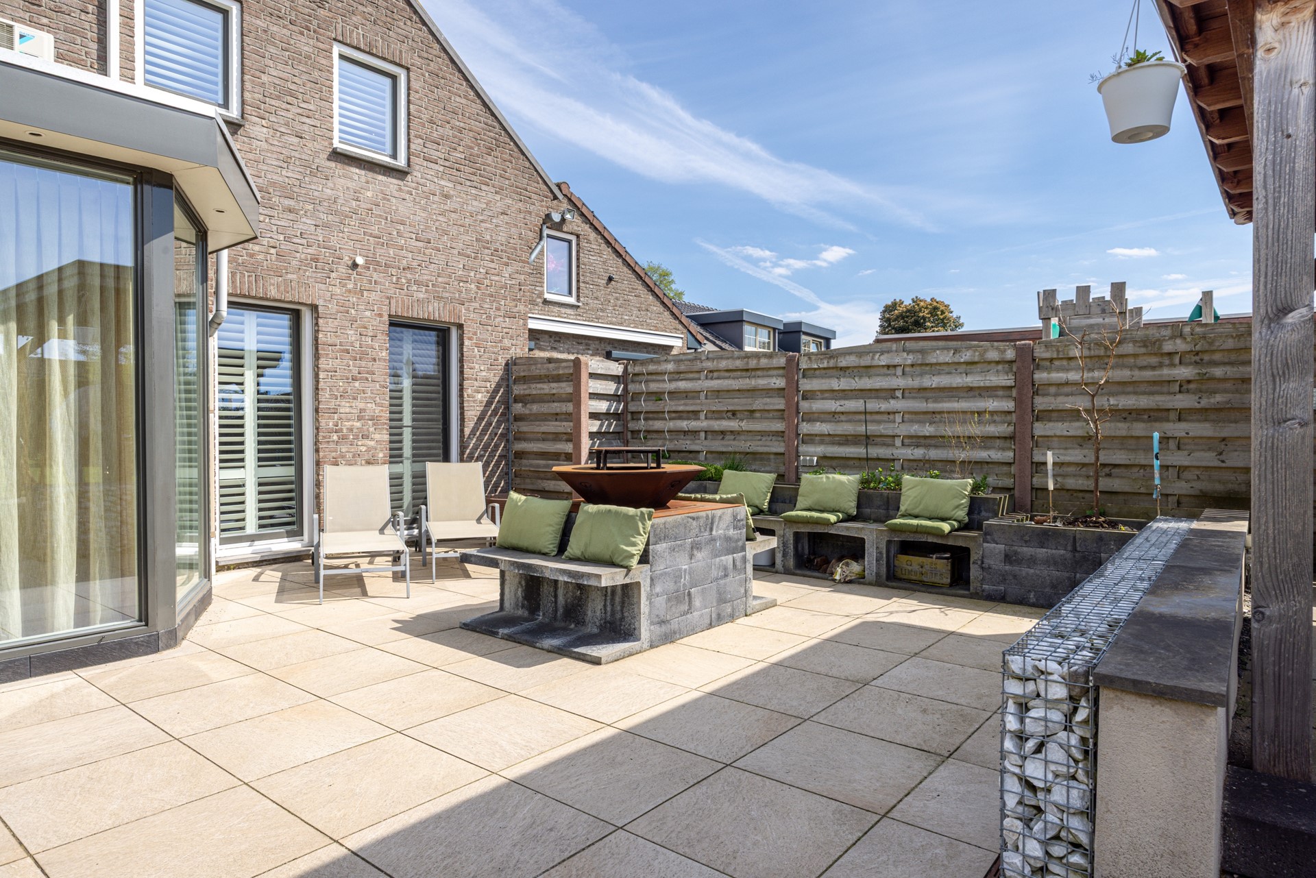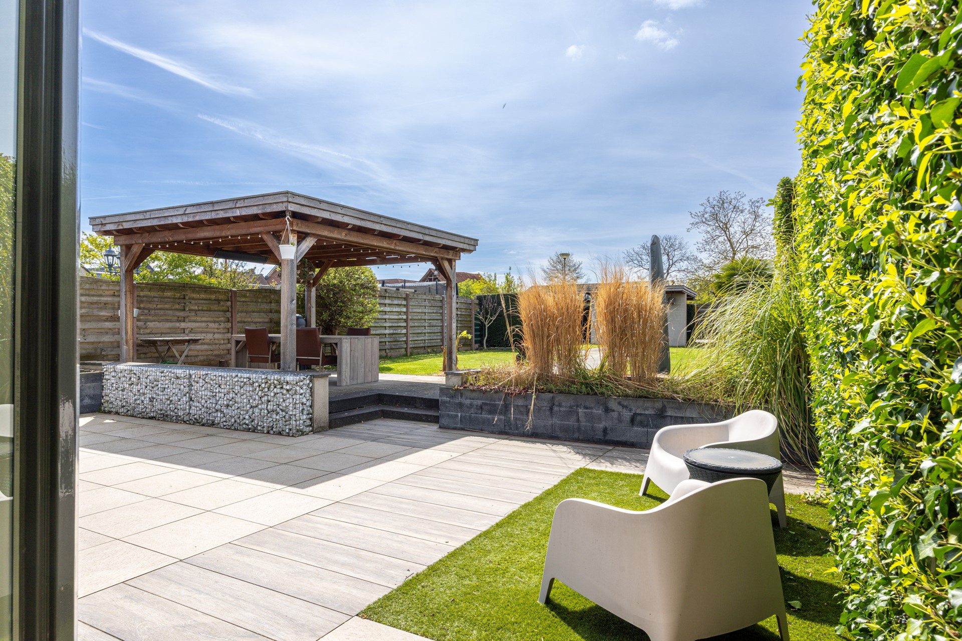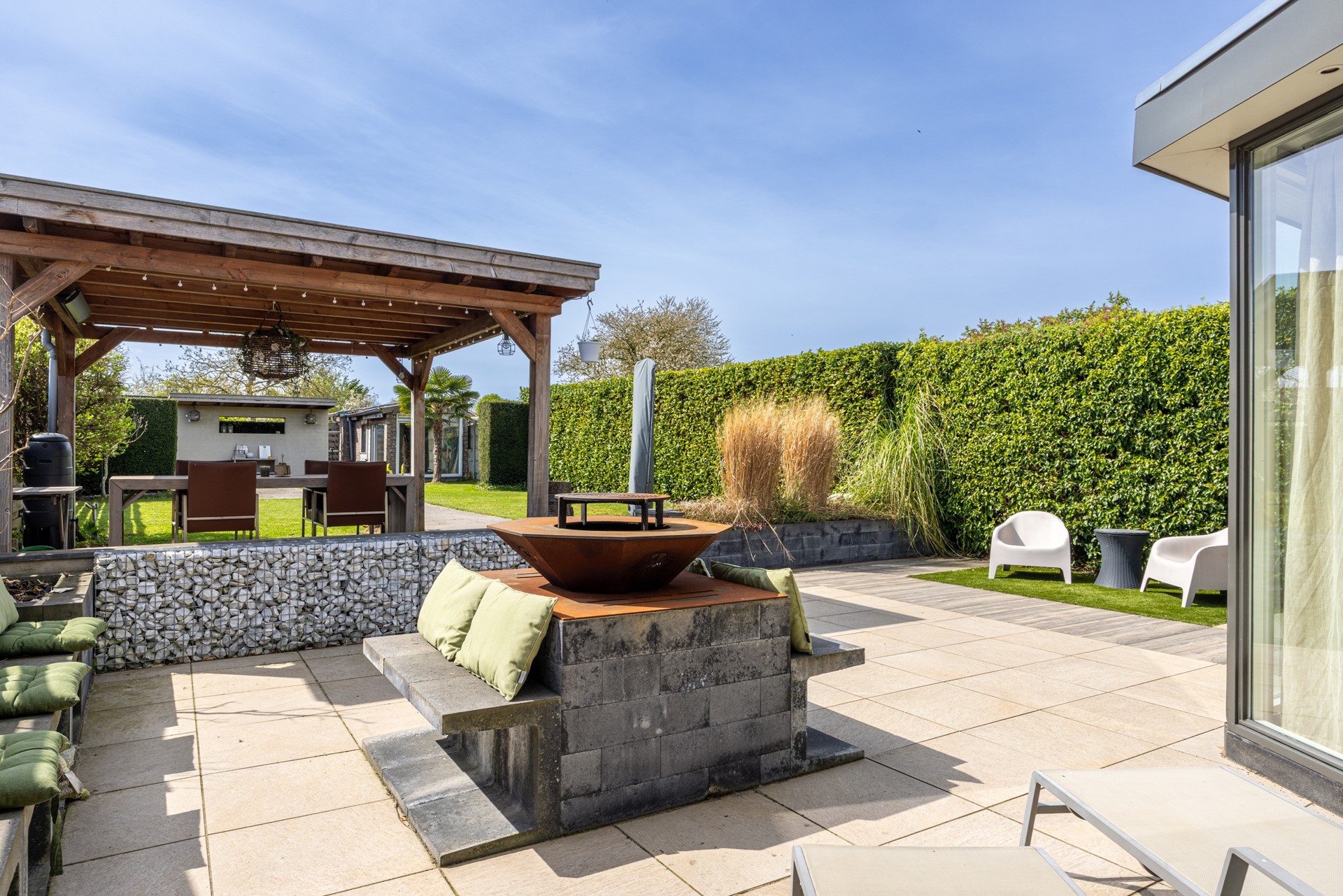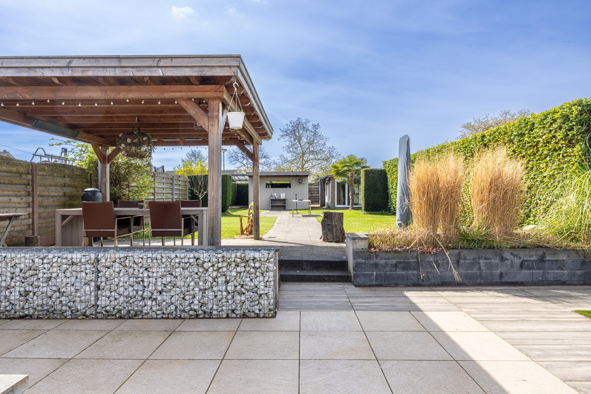 Direct achter de woning ligt een ruim terras, ideaal voor een zit- of eethoek. Aansluitend bevindt zich een sfeervolle overkapping, die zorgt voor een beschutte plek waar je al vroeg in het seizoen en tot laat in de avond comfortabel buiten kunt zitten. De combinatie van de overkapping met de vaste elementen, zoals de geïntegreerde zitgelegenheid, geeft deze plek een eigen karakter en maakt het een fijne plek om langere tijd buiten te verblijven.