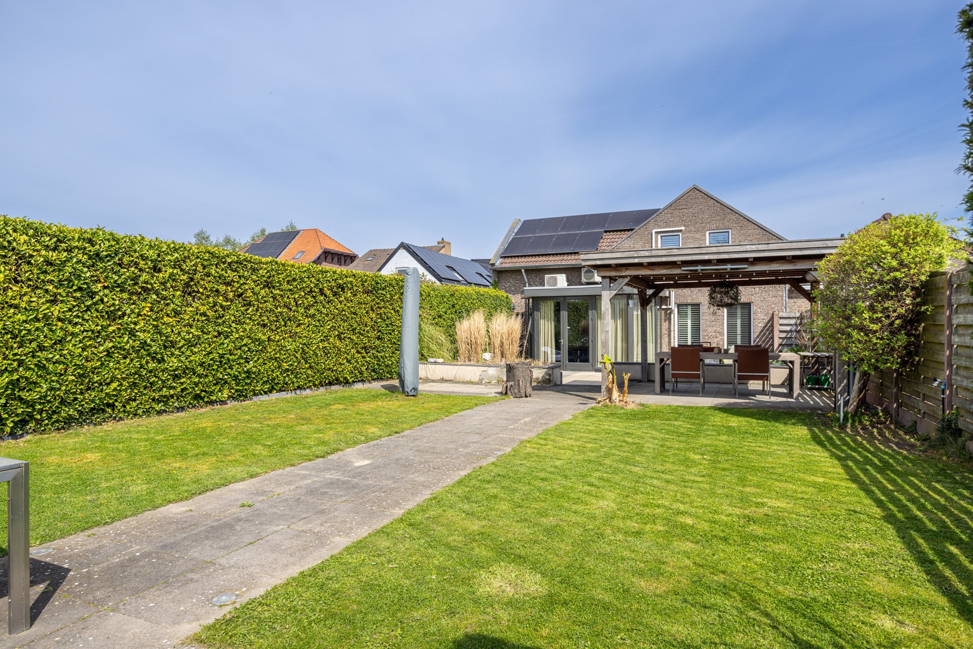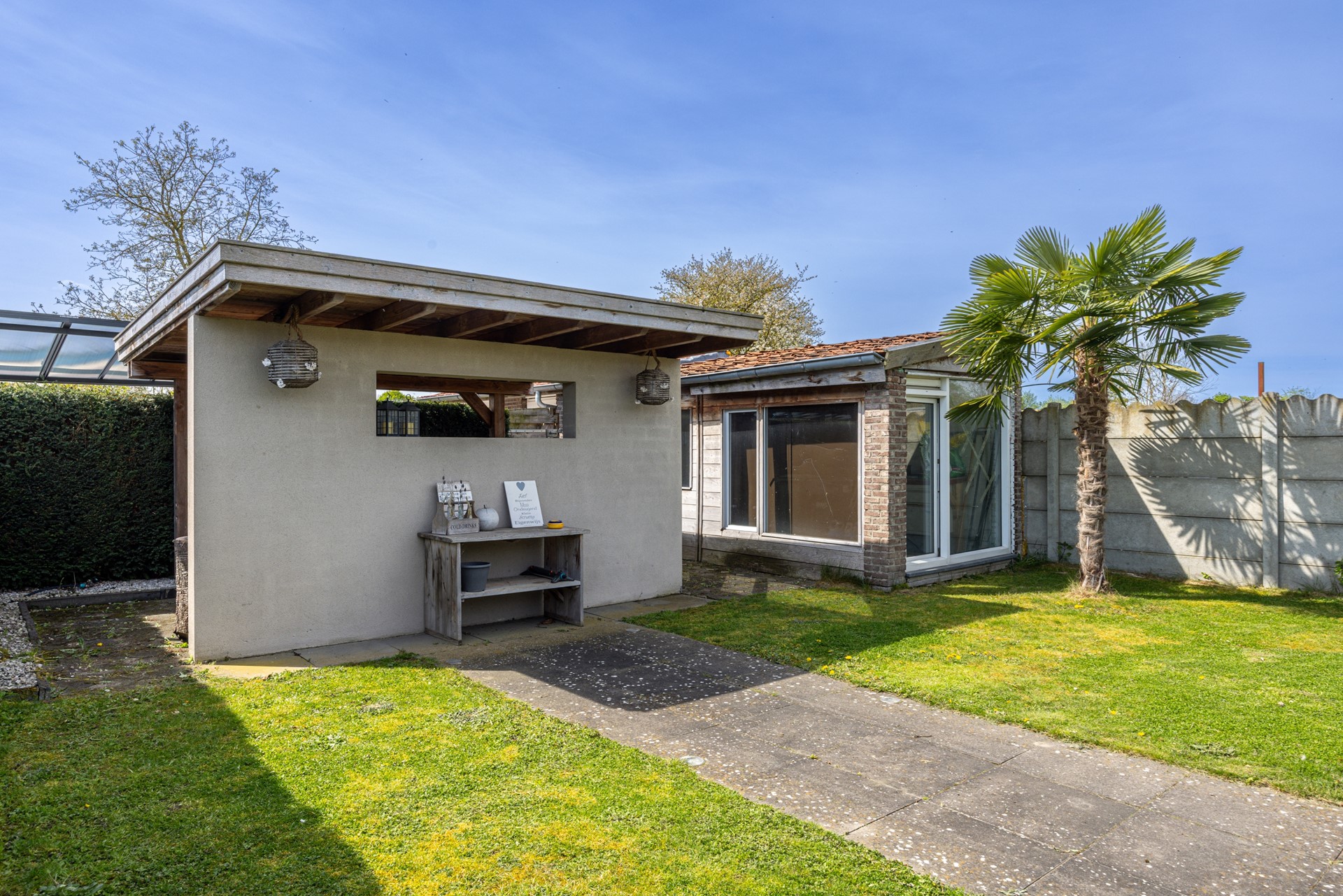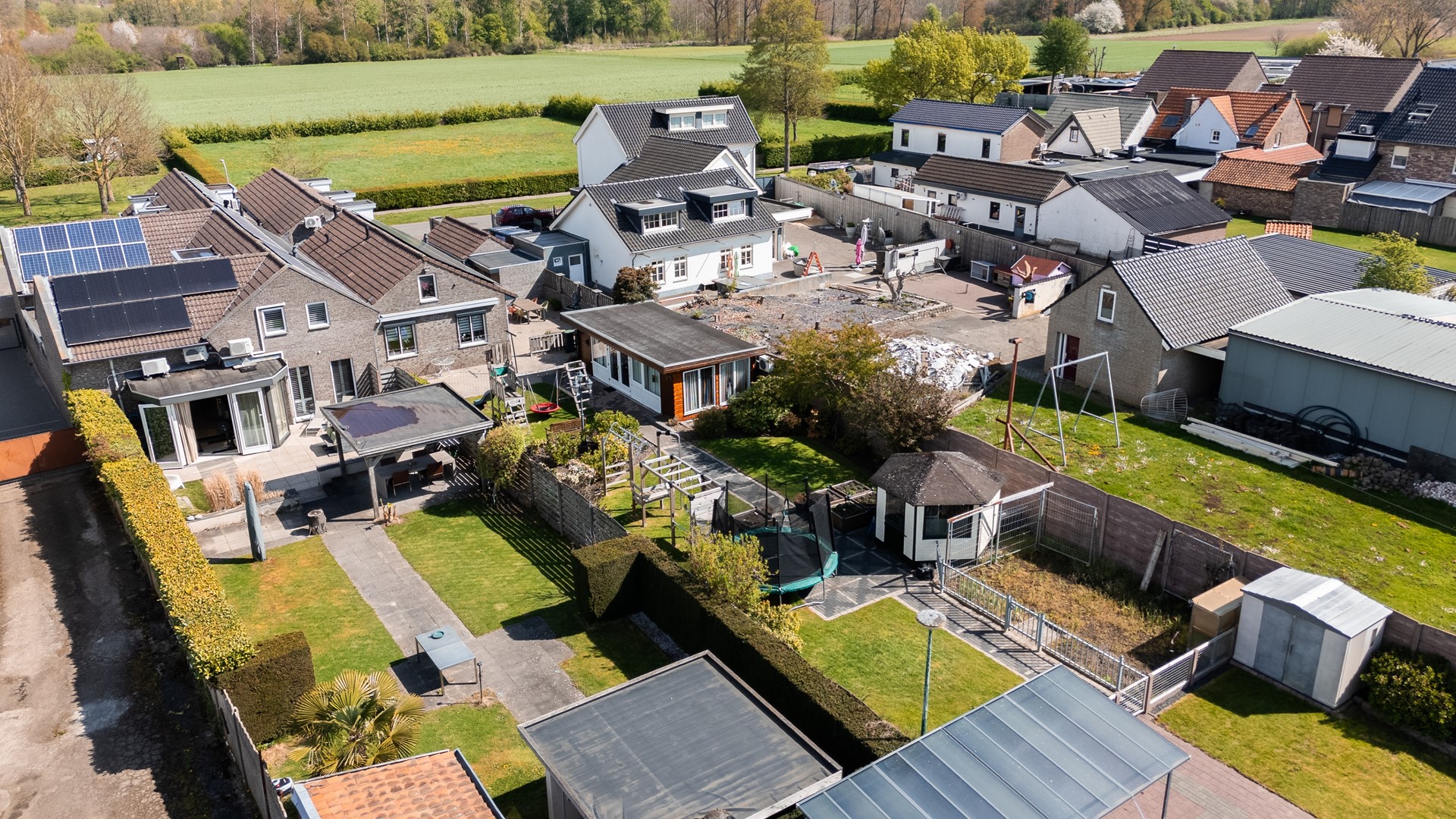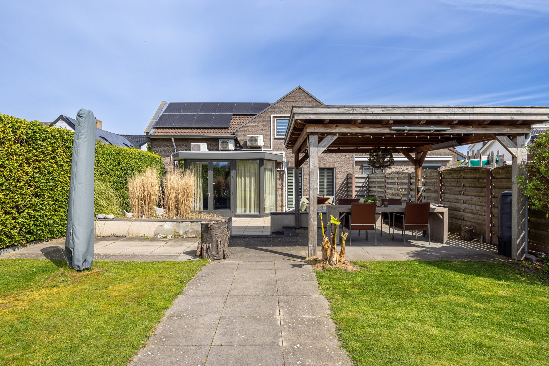 Direct achter de woning ligt een ruim terras, ideaal voor een zit- of eethoek. Aansluitend bevindt zich een sfeervolle overkapping, die zorgt voor een beschutte plek waar je al vroeg in het seizoen en tot laat in de avond comfortabel buiten kunt zitten. De combinatie van de overkapping met de vaste elementen, zoals de geïntegreerde zitgelegenheid, geeft deze plek een eigen karakter en maakt het een fijne plek om langere tijd buiten te verblijven.