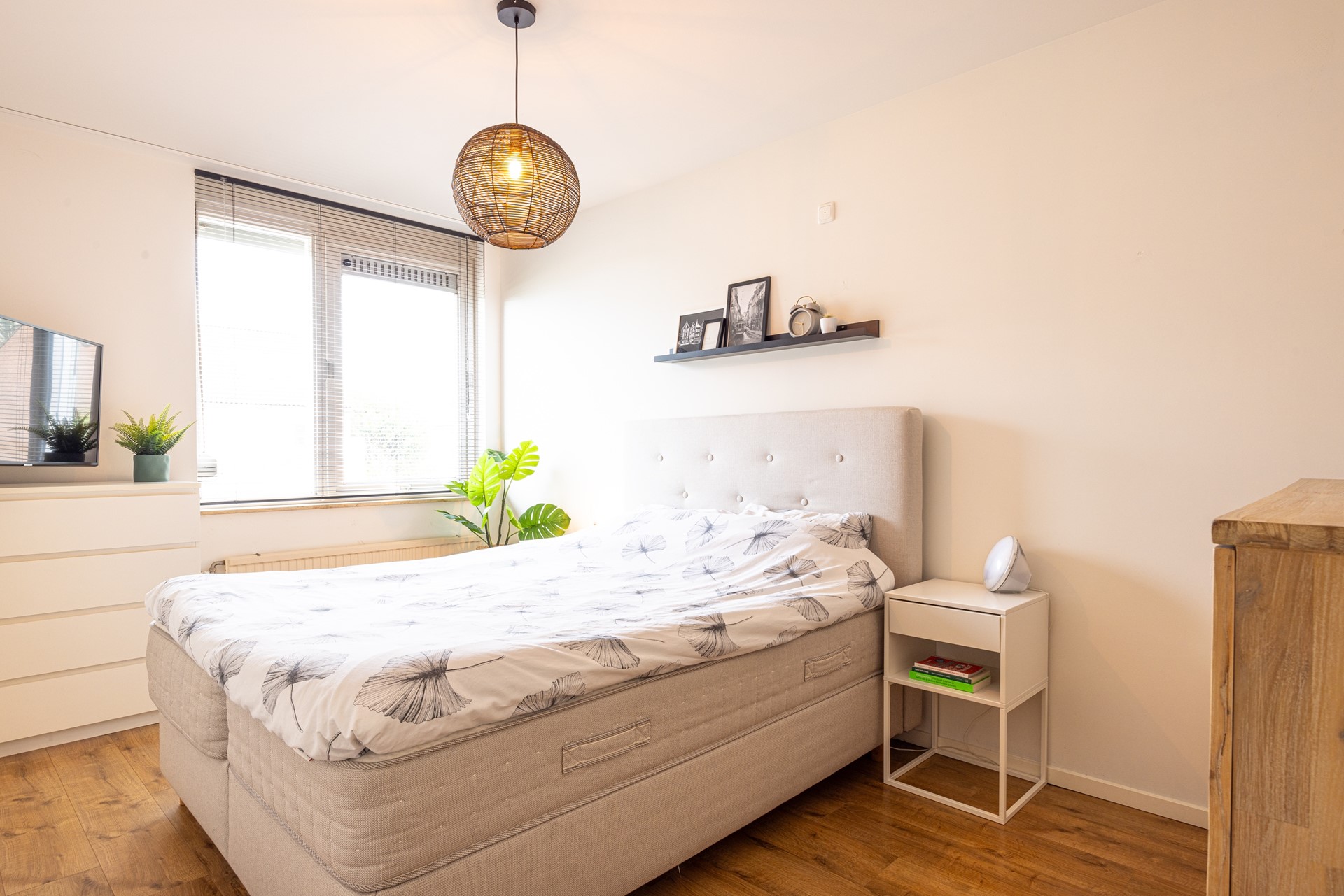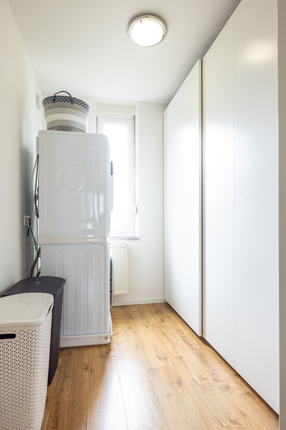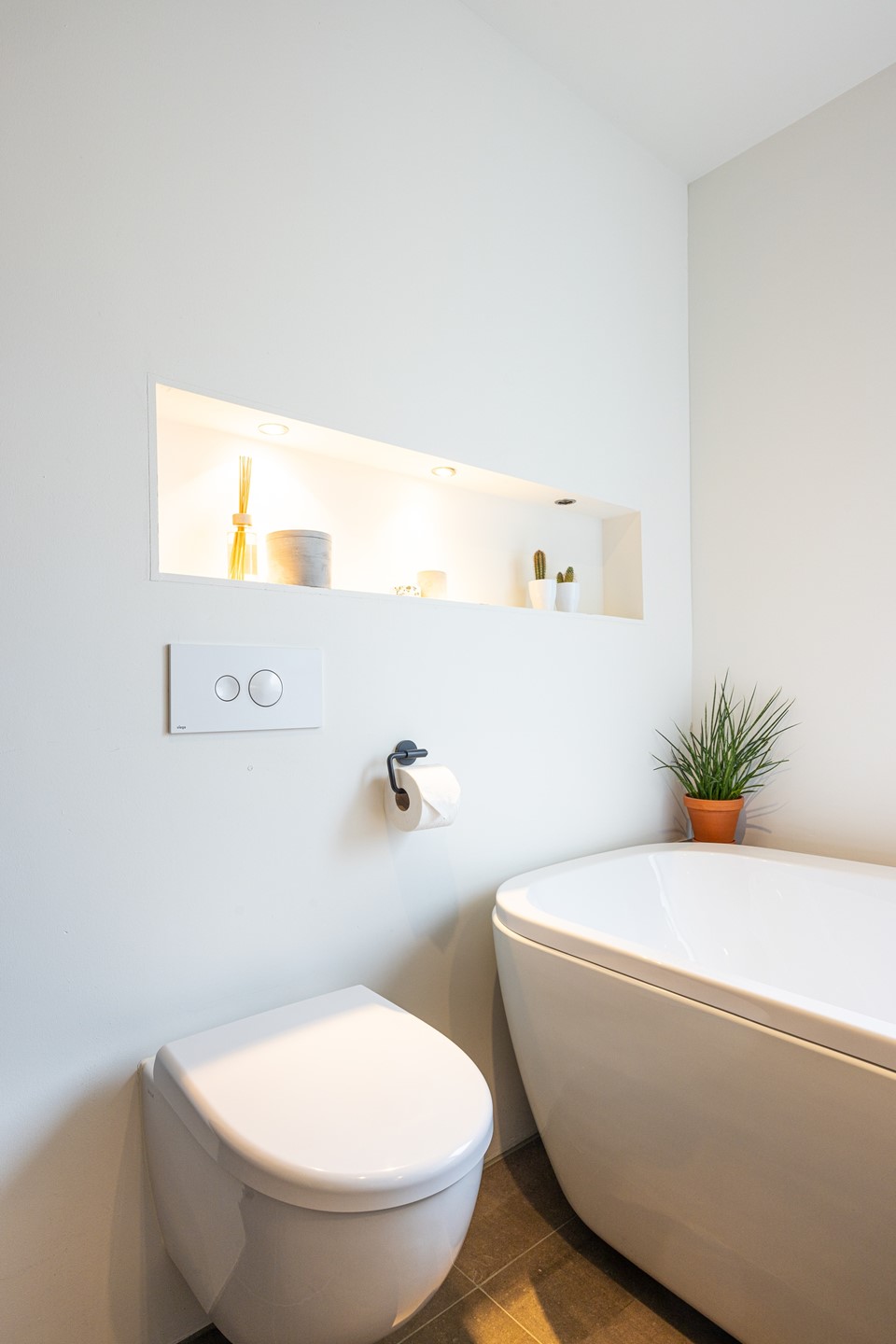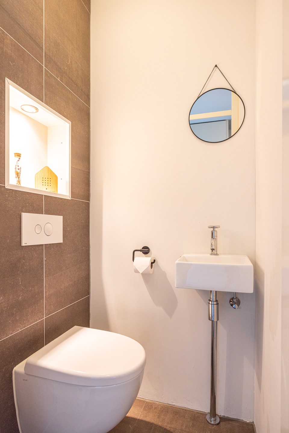 De stijlvolle badkamer combineert praktisch design met moderne elegantie. Voorzien van een ruime inloopdouche met een glazen wand, een vrijstaand bad, een tweede toilet en een badkamermeubel, compleet met een waskom en een spiegel voorzien van een warmfunctie die beslaan voorkomt (anti-condens). Een design radiator zorgt voor een aangename temperatuur en het rolluik biedt privacy wanneer gewenst.