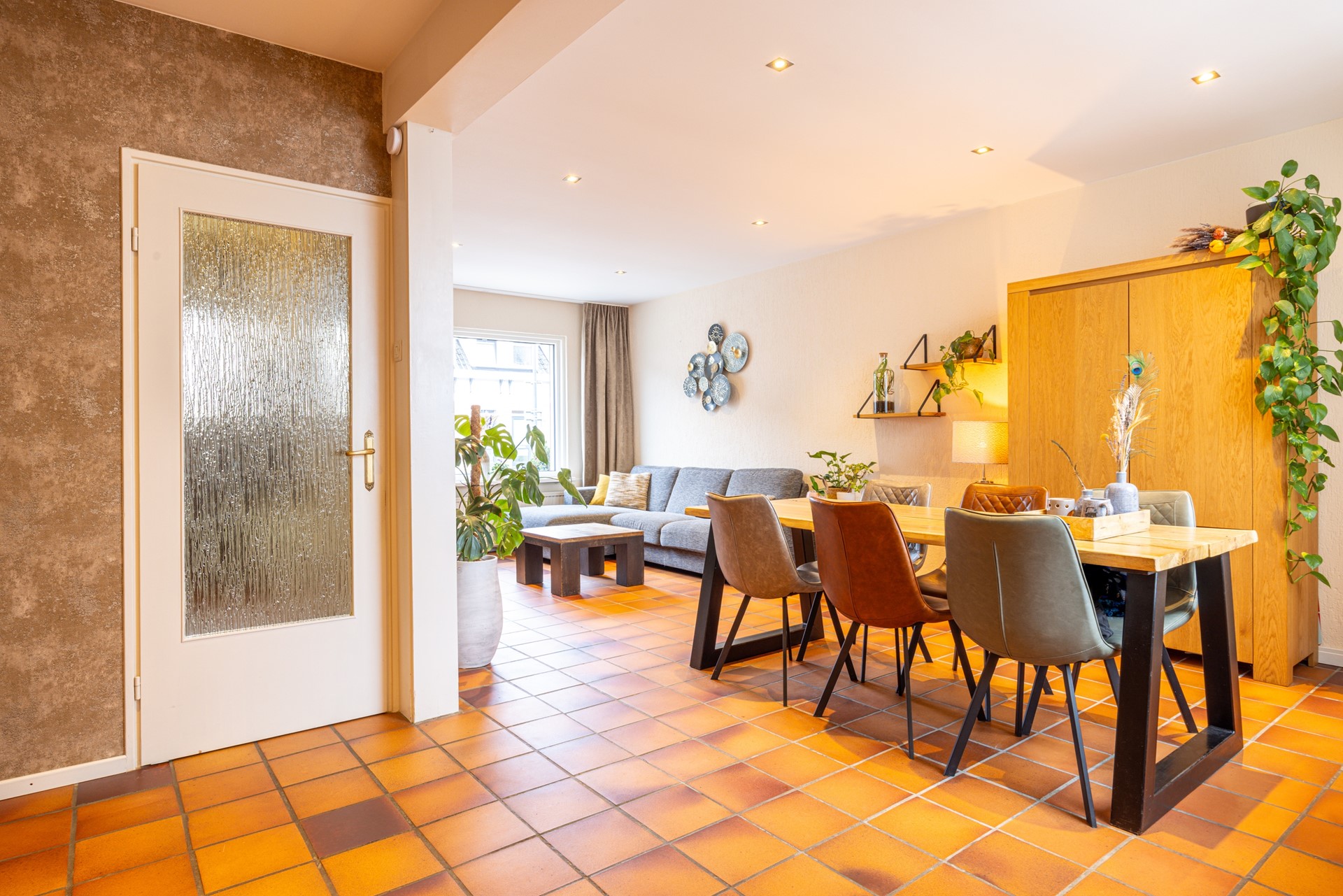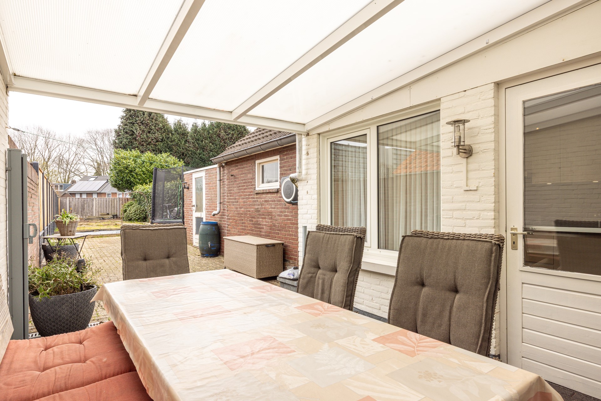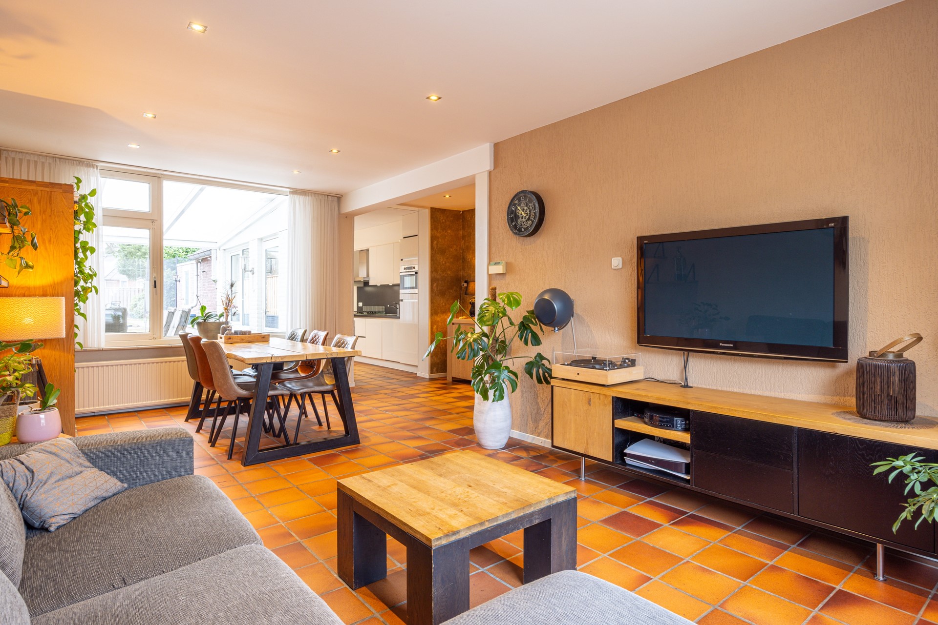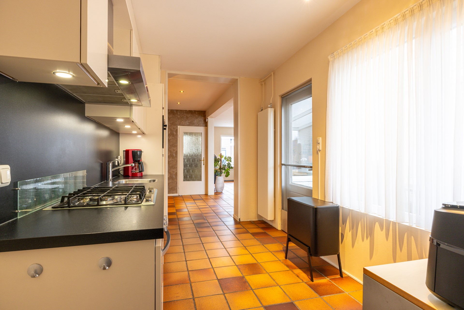 Via de verzorgde voortuin bereik je de entree van de woning. In de ontvangsthal ligt een tegelvloer en hier bevinden zich de garderobe, het toilet en de toegang tot de provisiekelder. In deze kelder bevindt zich tevens de omvormer van de zonnepanelen en daarnaast is er voldoende bergruimte aanwezig. Vanuit de hal loop je door naar de woonkamer. De doorzonwoonkamer is ruim opgezet en voorzien van dezelfde tegelvloer als in de hal, wat zorgt voor een rustig en verzorgd geheel. Dankzij de grote raampartijen aan zowel de voor- als achterzijde valt er veel daglicht binnen. In het plafond zijn inbouwspots verwerkt en aan de voorzijde is een elektrisch bedienbaar rolluik aanwezig. De woonkamer staat in verbinding met de halfopen keuken. Deze keuken beschikt over voldoende werk- en kastruimte en is uitgerust met diverse inbouwapparatuur, waaronder een combi-heteluchtoven, een extra oven, een gasfornuis, afzuigkap, koelkast en vaatwasser. Het aanwezige raam zorgt hier voor prettig daglicht. Vanuit de keuken is er directe toegang tot het overdekte terras in de achtertuin. Aansluitend aan de keuken bevindt zich de bijkeuken. Hier zijn de witgoedaansluitingen gesitueerd en er is volop ruimte aanwezig voor het plaatsen van extra voorraad of opbergkasten.