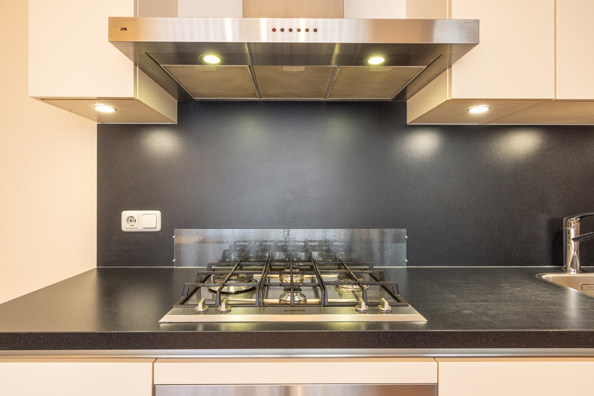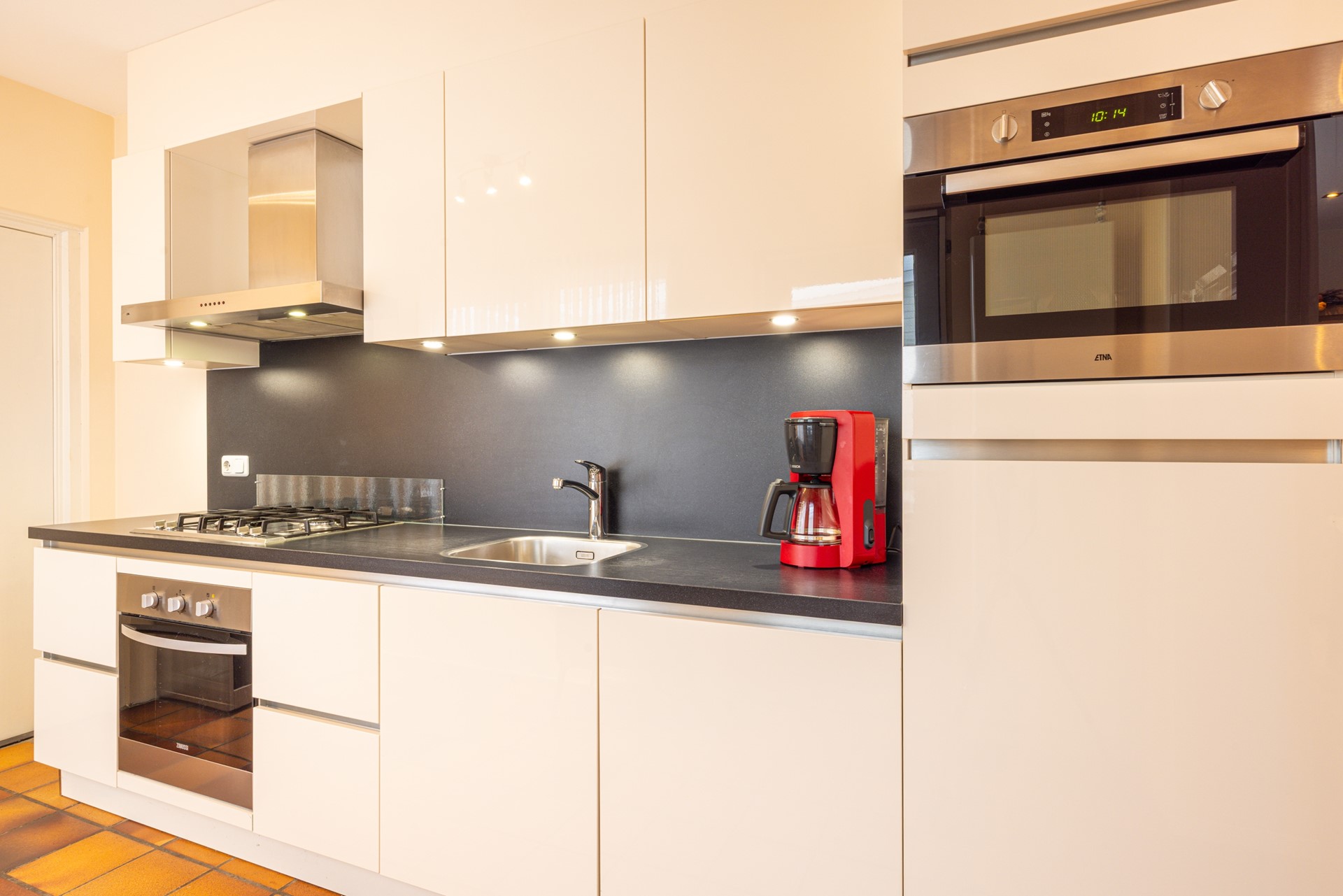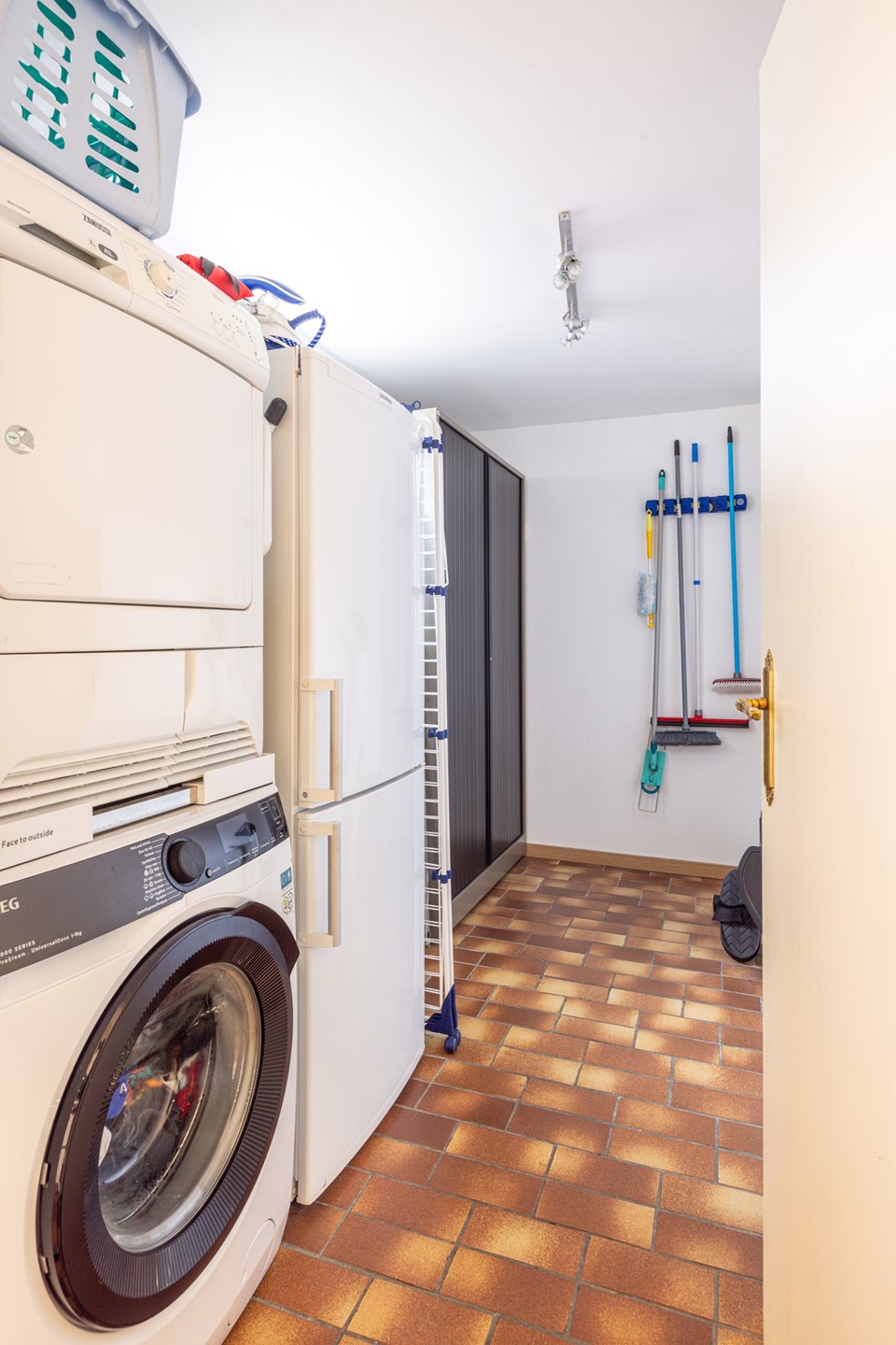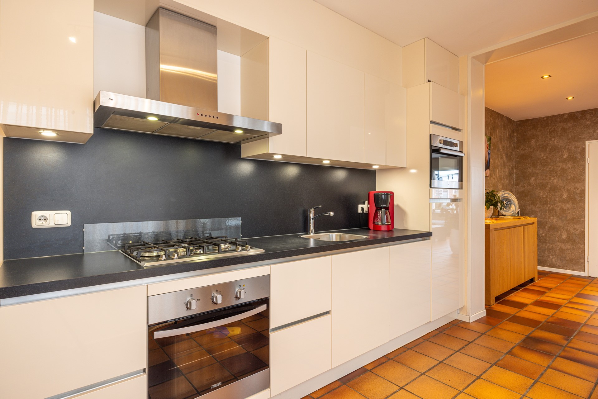 Via de verzorgde voortuin bereik je de entree van de woning. In de ontvangsthal ligt een tegelvloer en hier bevinden zich de garderobe, het toilet en de toegang tot de provisiekelder. In deze kelder bevindt zich tevens de omvormer van de zonnepanelen en daarnaast is er voldoende bergruimte aanwezig. Vanuit de hal loop je door naar de woonkamer. De doorzonwoonkamer is ruim opgezet en voorzien van dezelfde tegelvloer als in de hal, wat zorgt voor een rustig en verzorgd geheel. Dankzij de grote raampartijen aan zowel de voor- als achterzijde valt er veel daglicht binnen. In het plafond zijn inbouwspots verwerkt en aan de voorzijde is een elektrisch bedienbaar rolluik aanwezig. De woonkamer staat in verbinding met de halfopen keuken. Deze keuken beschikt over voldoende werk- en kastruimte en is uitgerust met diverse inbouwapparatuur, waaronder een combi-heteluchtoven, een extra oven, een gasfornuis, afzuigkap, koelkast en vaatwasser. Het aanwezige raam zorgt hier voor prettig daglicht. Vanuit de keuken is er directe toegang tot het overdekte terras in de achtertuin. Aansluitend aan de keuken bevindt zich de bijkeuken. Hier zijn de witgoedaansluitingen gesitueerd en er is volop ruimte aanwezig voor het plaatsen van extra voorraad of opbergkasten.
