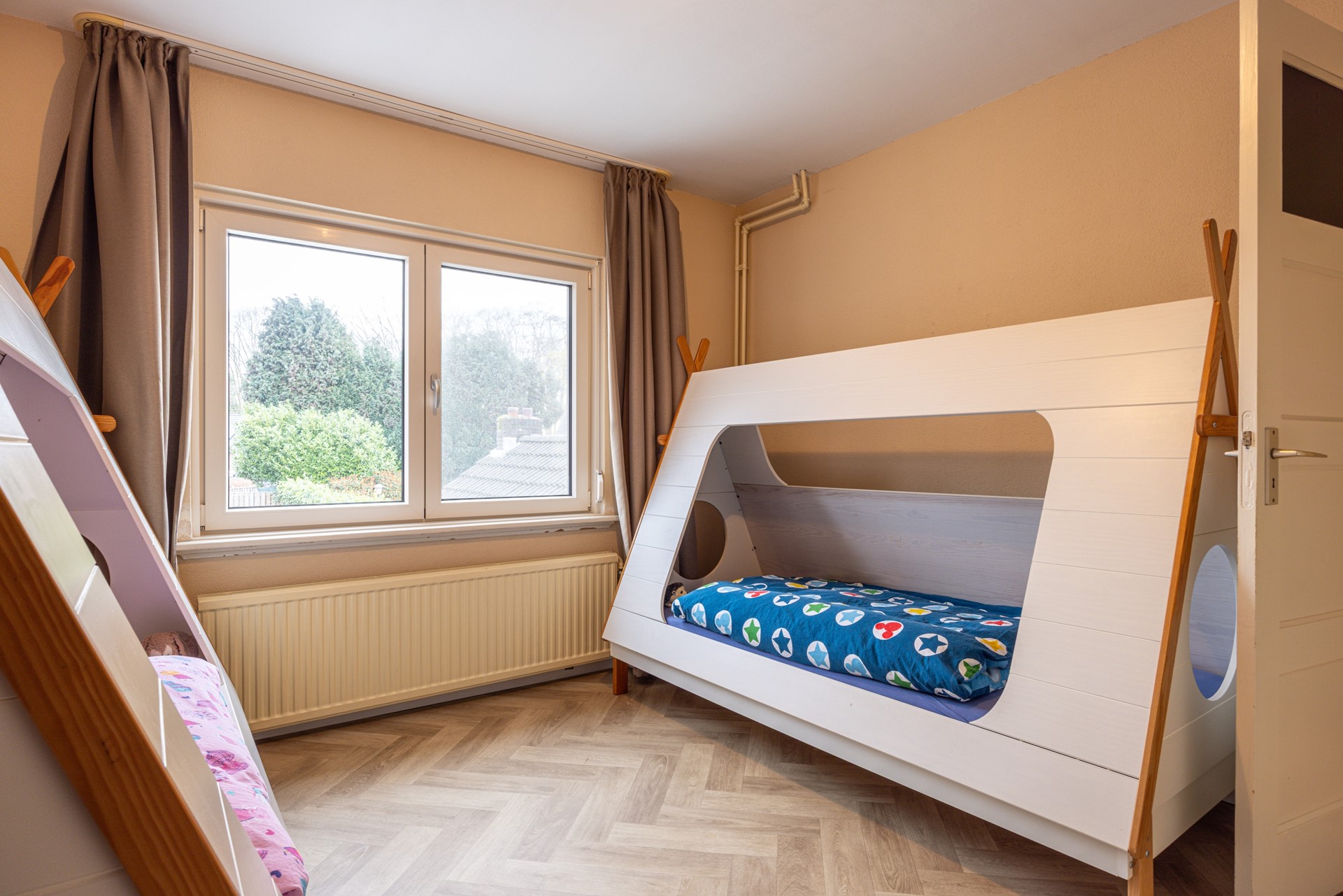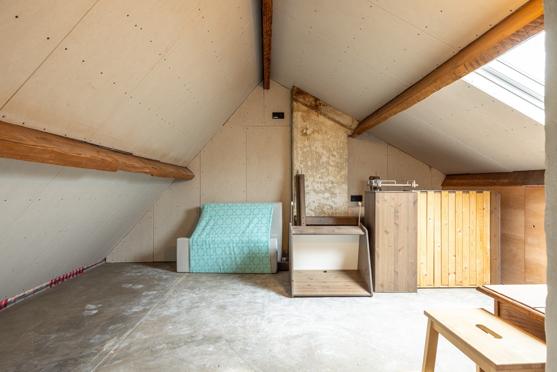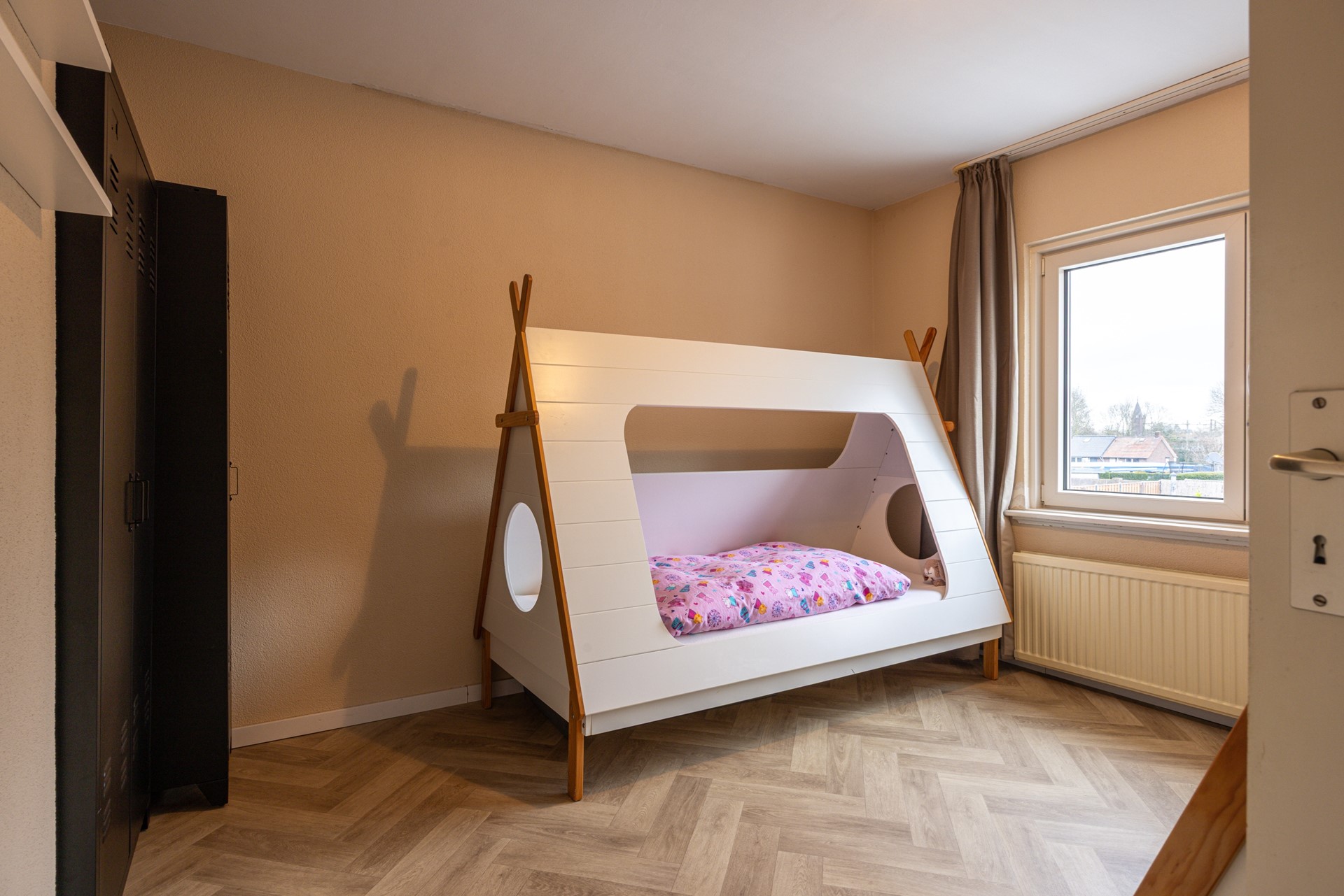 Op deze verdieping bevindt zich daarnaast een ruime extra kamer. Het grote Velux dakraam, geplaatst in 2025, zorgt hier voor veel natuurlijk daglicht. Door de open kap voelt de ruimte aangenaam ruim aan. De kamer is geïsoleerd, voorzien van een verwarming en daardoor geschikt voor verschillende doeleinden, zoals een derde slaapkamer, hobbyruimte, werkplek of speelkamer.