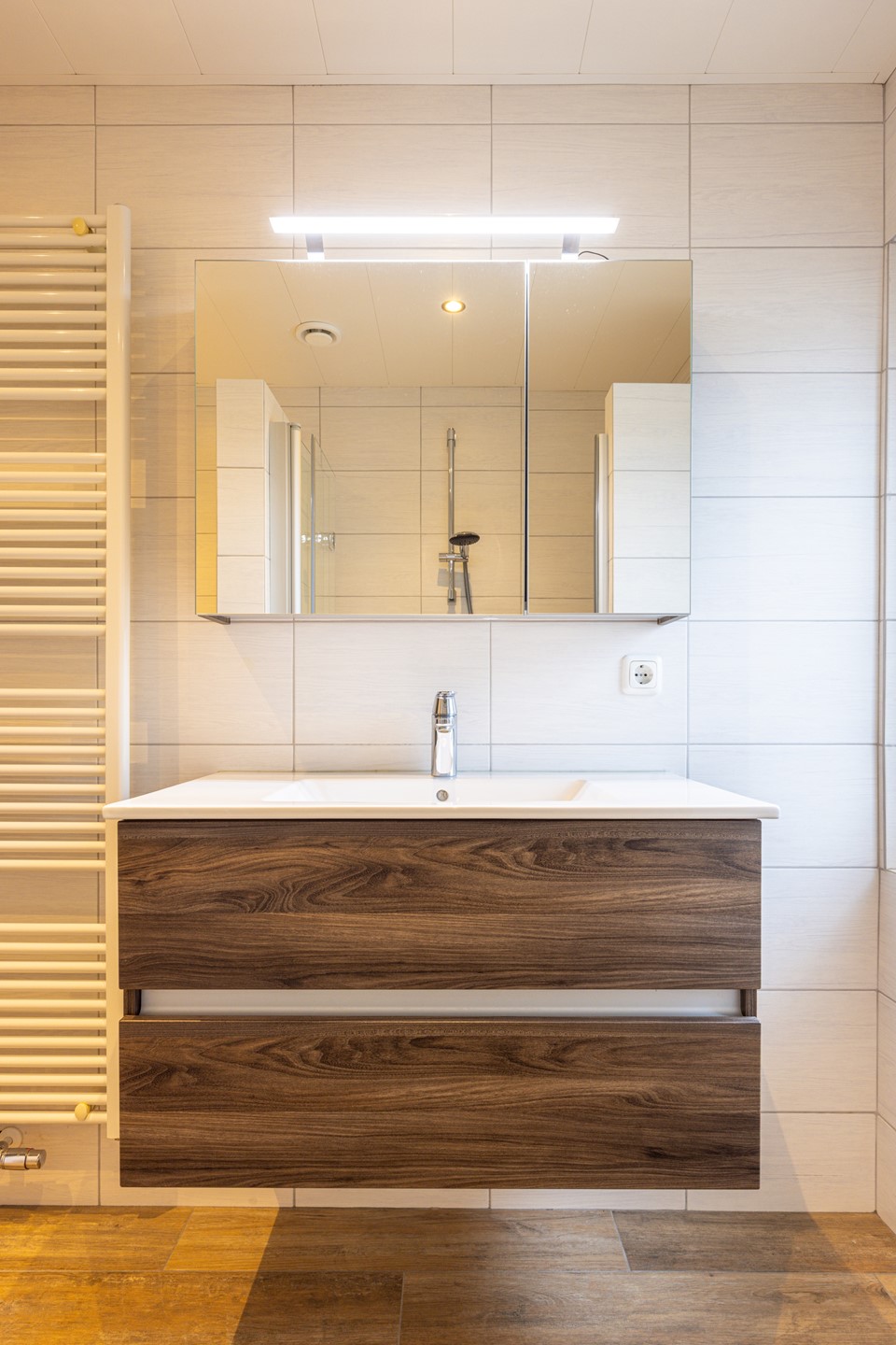 De eerste verdieping is bereikbaar via de trap vanuit de hal. De overloop geeft toegang tot twee slaapkamers, de badkamer en een berging. Beide slaapkamers zijn voorzien van een vinylvloer en genieten van veel daglicht dankzij de grote ramen. Daarnaast beschikken beide kamers over rolluiken en een praktische muurkast voor extra bergruimte. Door de prettige afmetingen zijn de kamers goed te gebruiken als slaap-, werk- of kinderkamer. De badkamer is verzorgd afgewerkt en volledig betegeld. De ruimte is ingericht met een ruime inloopdouche met glazen douchewand, een breed badkamermeubel met wastafel en een bijpassende spiegel met verlichting. Verder beschikt de badkamer over een toilet, een designradiator en inbouwspots in het plafond. Het aanwezige rolluik zorgt daarnaast voor extra comfort en privacy.