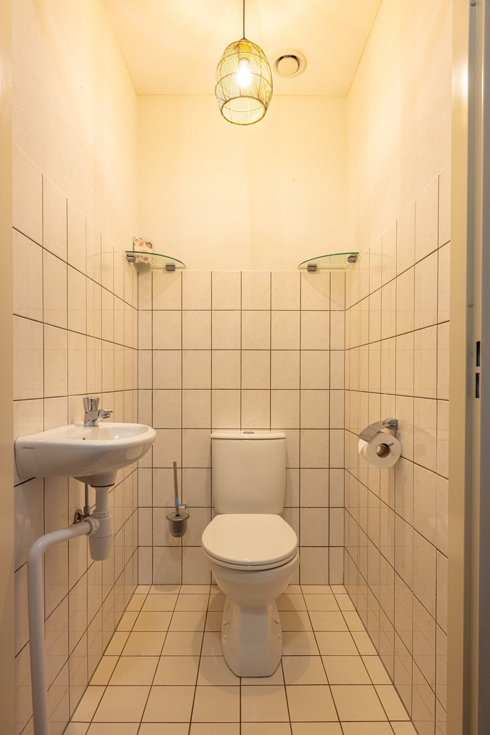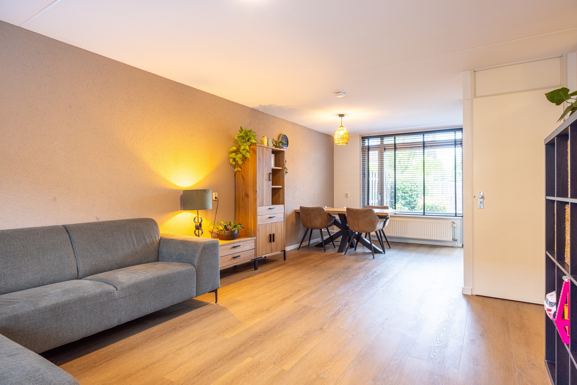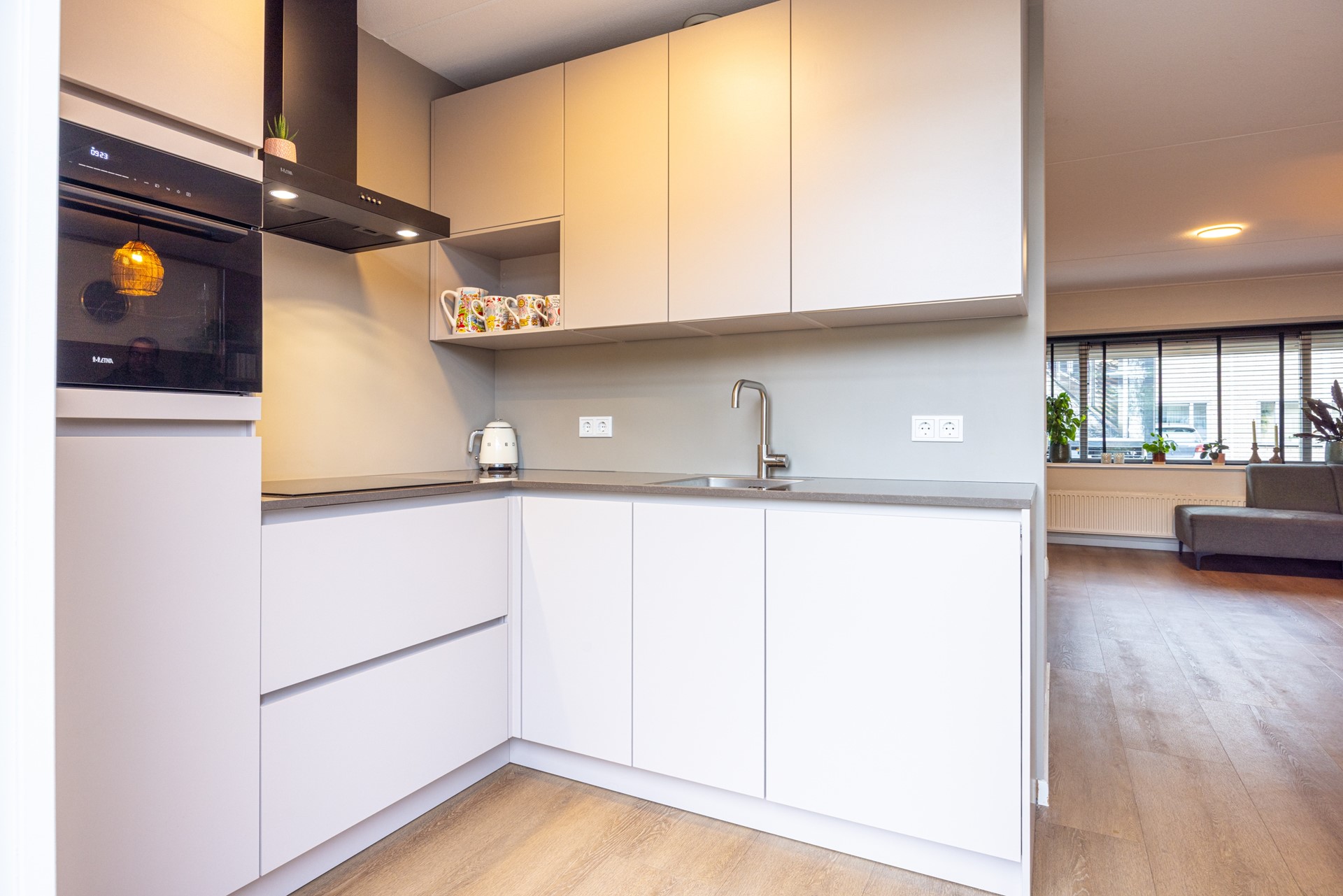 Bij aankomst treft u een verzorgde voortuin en een eigen parkeerplaats. De ontvangsthal is voorzien van een tegelvloer, garderobe en meterkast. Vanuit hier loopt u door naar de doorzon woonkamer, die dankzij de grote ramen geniet van veel daglicht. De pvc-vloer en de strakke afwerking zorgen voor een warme uitstraling. Aan de voorzijde is een rolluik geplaatst en via de woonkamer is er toegang tot de achtertuin. De trapopgang is netjes afgesloten met een deur. Aan de woonkamer grenst een tussenportaal met toegang tot het toilet, uitgerust met staand closet en fonteintje. De open keuken (2024) sluit prachtig aan op de stijl van de woonkamer en is voorzien van dezelfde pvc-vloer. De keuken is modern uitgevoerd, beschikt over veel kastruimte en is uitgerust met inbouwapparatuur: inductiekookplaat, afzuigkap, combi-heteluchtoven, koelkast en vaatwasser.