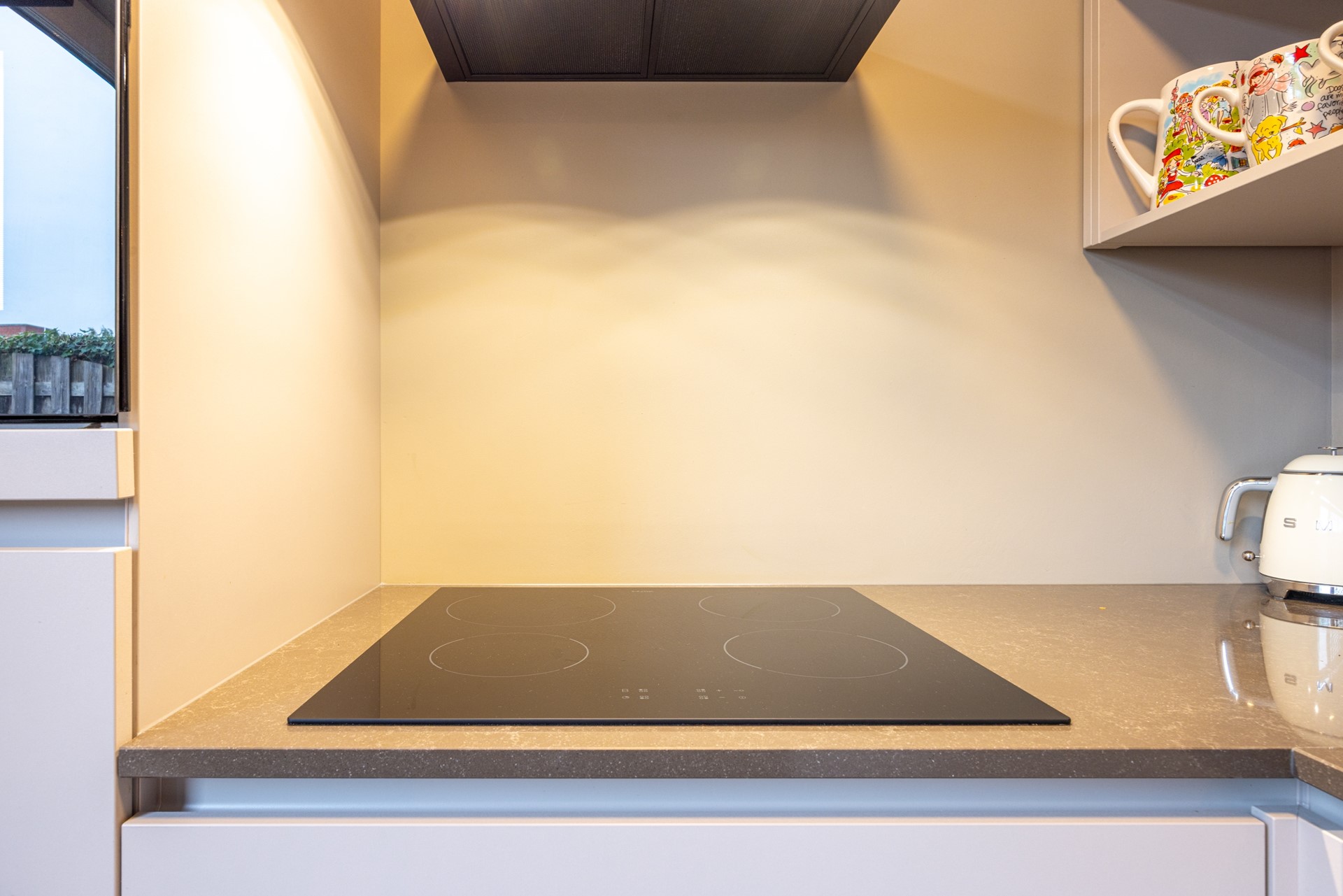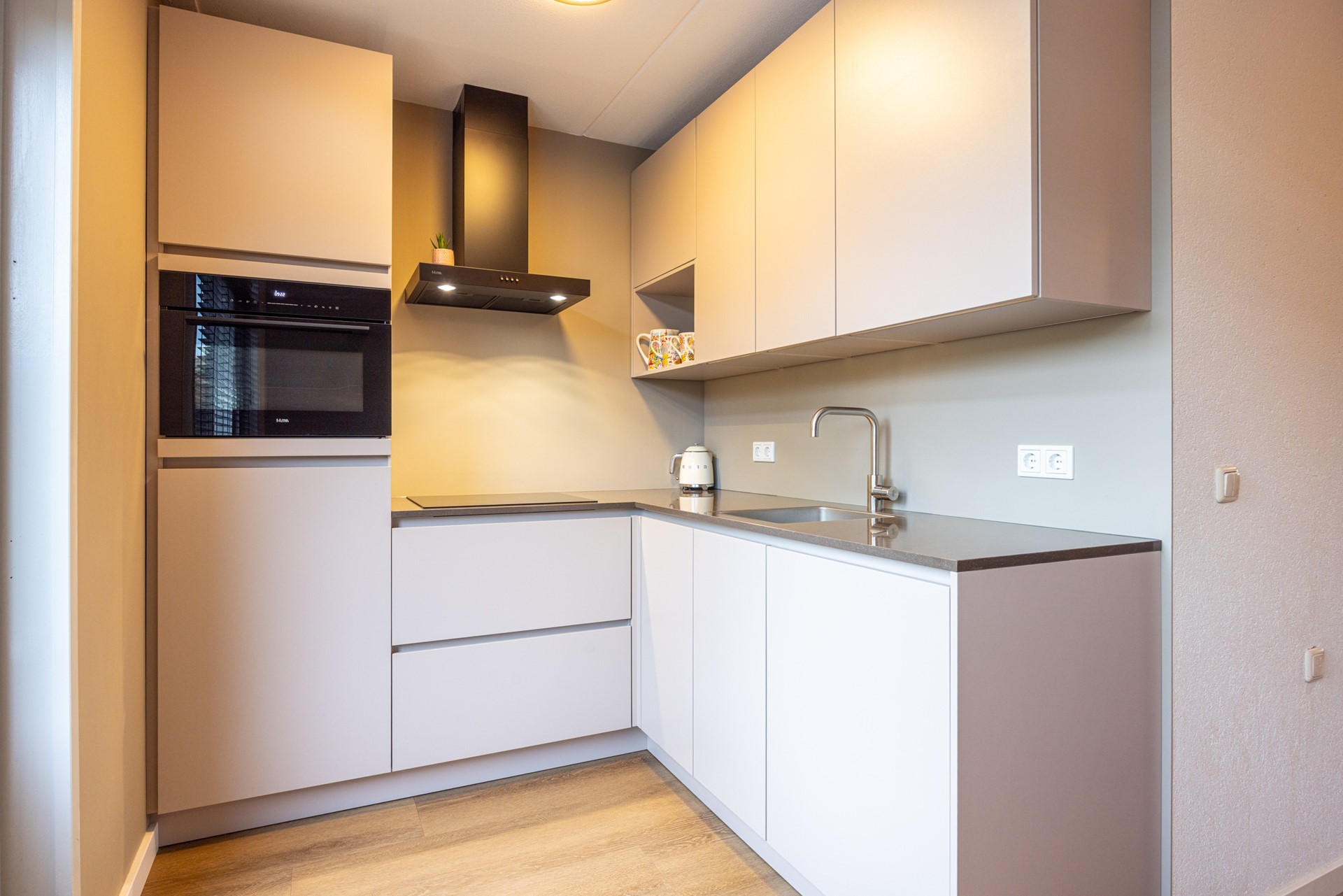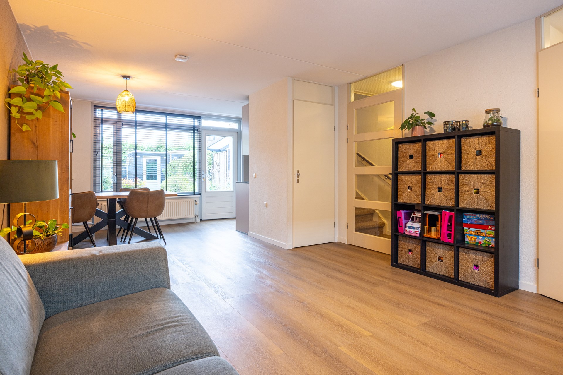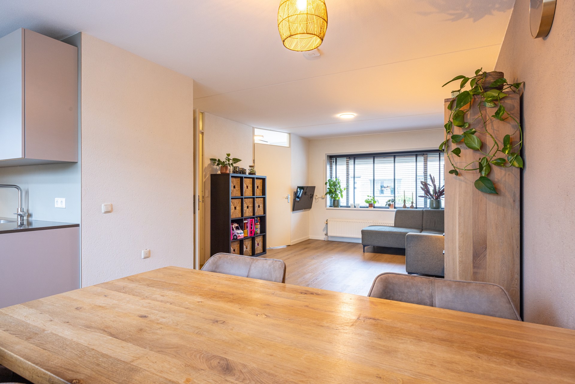 Bij aankomst treft u een verzorgde voortuin en een eigen parkeerplaats. De ontvangsthal is voorzien van een tegelvloer, garderobe en meterkast. Vanuit hier loopt u door naar de doorzon woonkamer, die dankzij de grote ramen geniet van veel daglicht. De pvc-vloer en de strakke afwerking zorgen voor een warme uitstraling. Aan de voorzijde is een rolluik geplaatst en via de woonkamer is er toegang tot de achtertuin. De trapopgang is netjes afgesloten met een deur. Aan de woonkamer grenst een tussenportaal met toegang tot het toilet, uitgerust met staand closet en fonteintje. De open keuken (2024) sluit prachtig aan op de stijl van de woonkamer en is voorzien van dezelfde pvc-vloer. De keuken is modern uitgevoerd, beschikt over veel kastruimte en is uitgerust met inbouwapparatuur: inductiekookplaat, afzuigkap, combi-heteluchtoven, koelkast en vaatwasser.