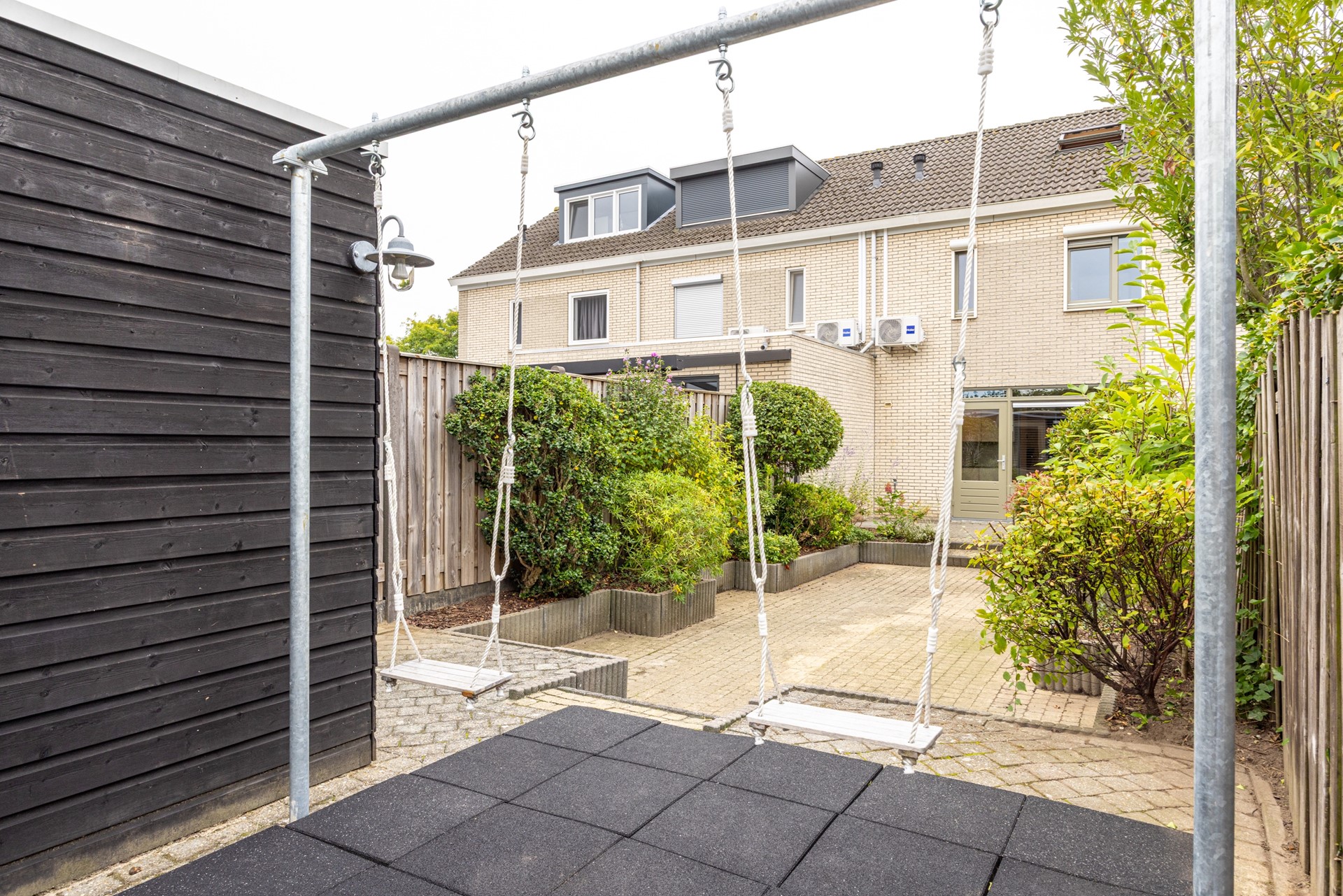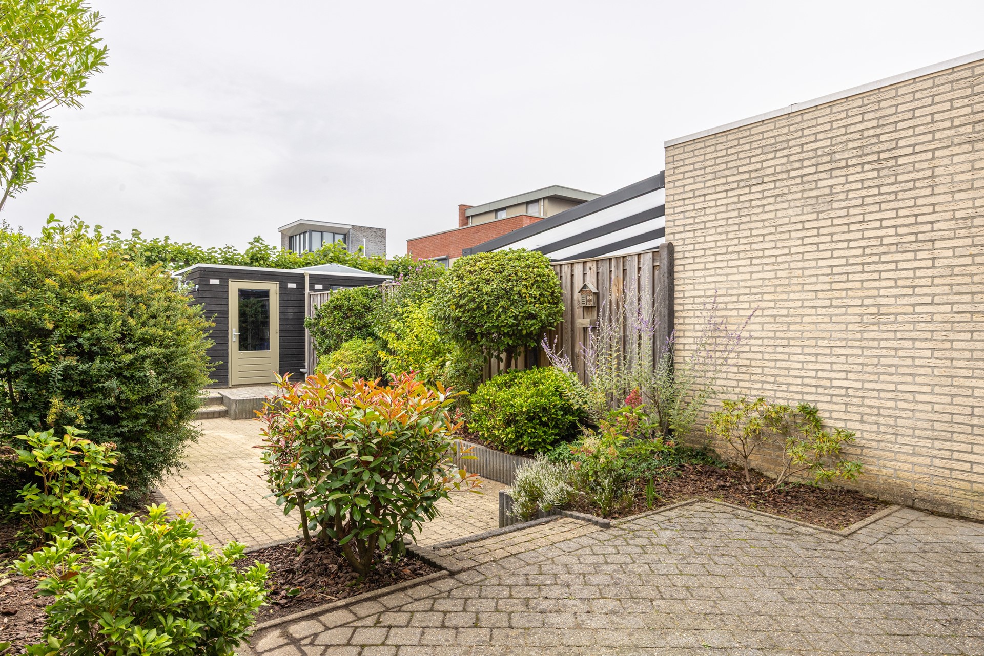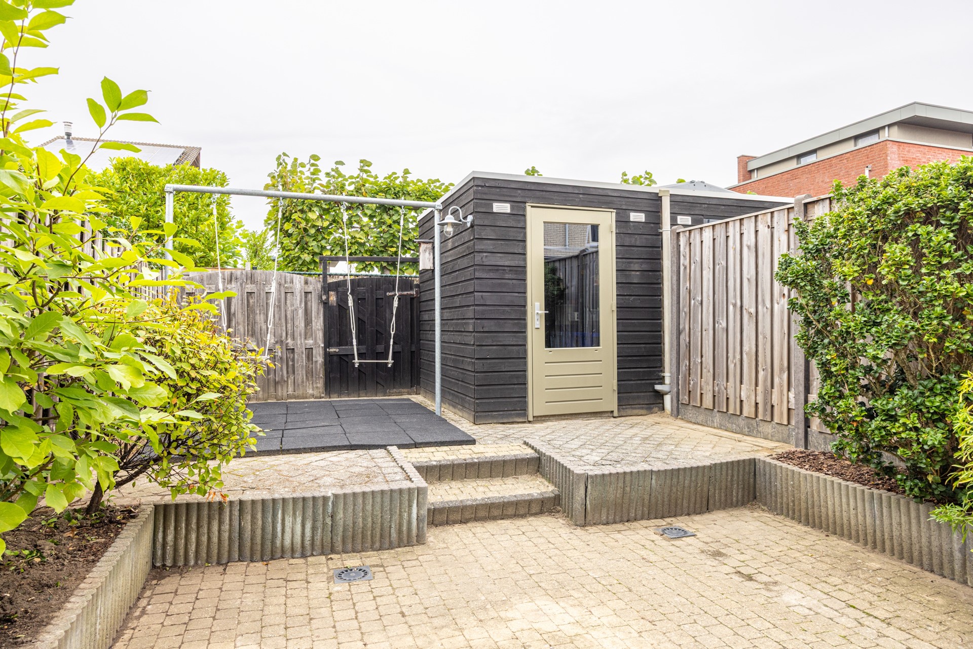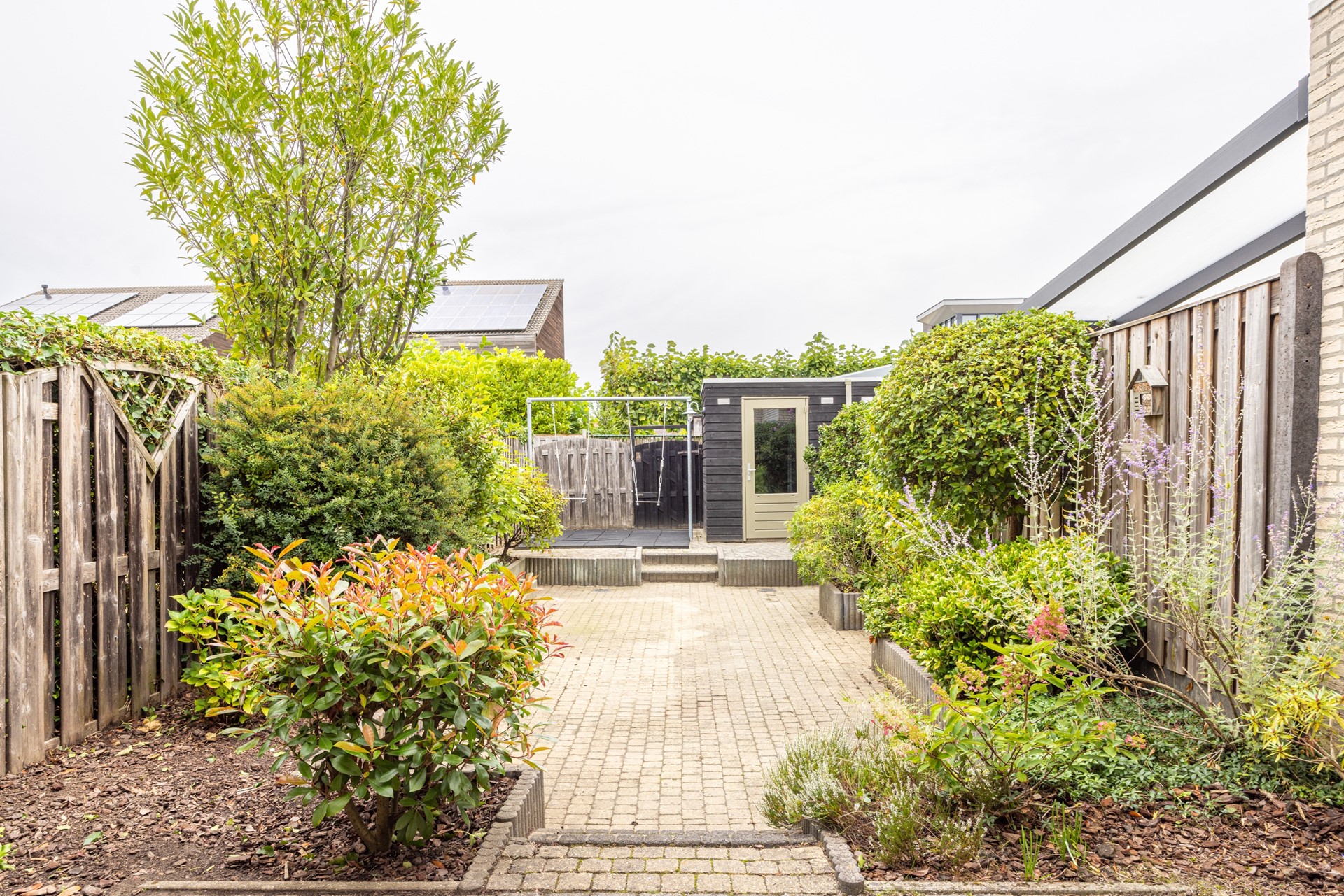 De achtertuin is netjes onderhouden en verzorgd met een combinatie van bestrating en groene borders. Er zijn meerdere zitplekken gecreëerd, waardoor u zowel van de zon als de schaduw kunt genieten. Achterin bevindt zich een ruime houten schuur met elektra en verlichting, ideaal voor fietsen, opslag of hobby’s. Via de praktische achterom is de tuin ook gemakkelijk bereikbaar.