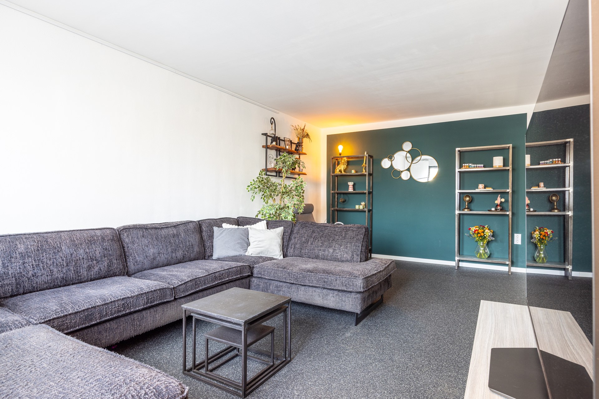 Je komt aan bij de verzorgde voortuin en de ruime oprit die doorloopt naar de garage. Binnenkomend in de hal valt de grindvloer meteen op: onderhoudsvriendelijk, strak en passend bij de rest van de begane grond. In de hal bevinden zich de garderobe, het toilet met fonteintje en de toegang tot de kelder. De kelder is een echte bergruimte met voldoende plek voor opslag. Hier vind je ook de witgoedaansluitingen, ideaal om de wasmachine en droger uit de leefruimtes te houden.