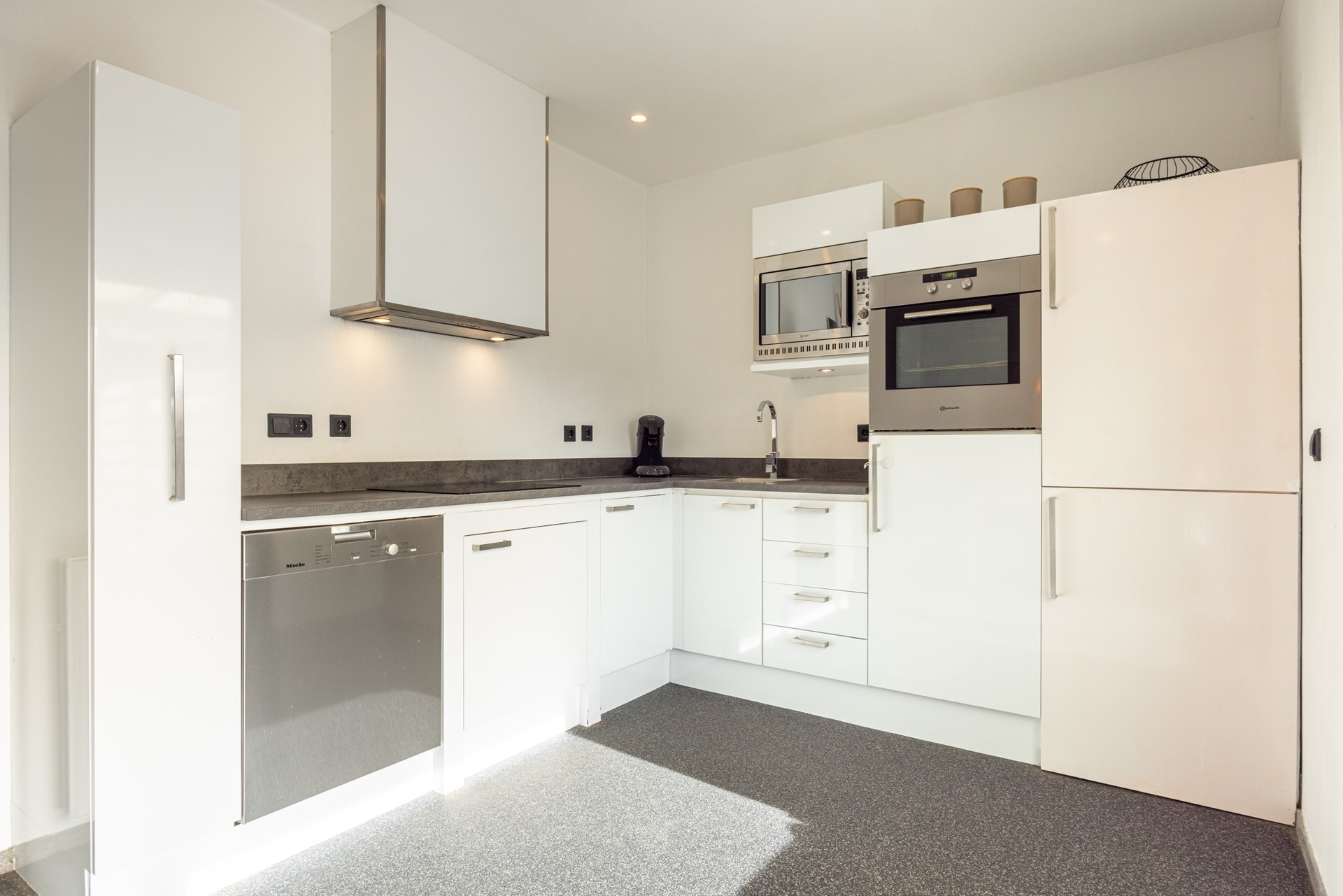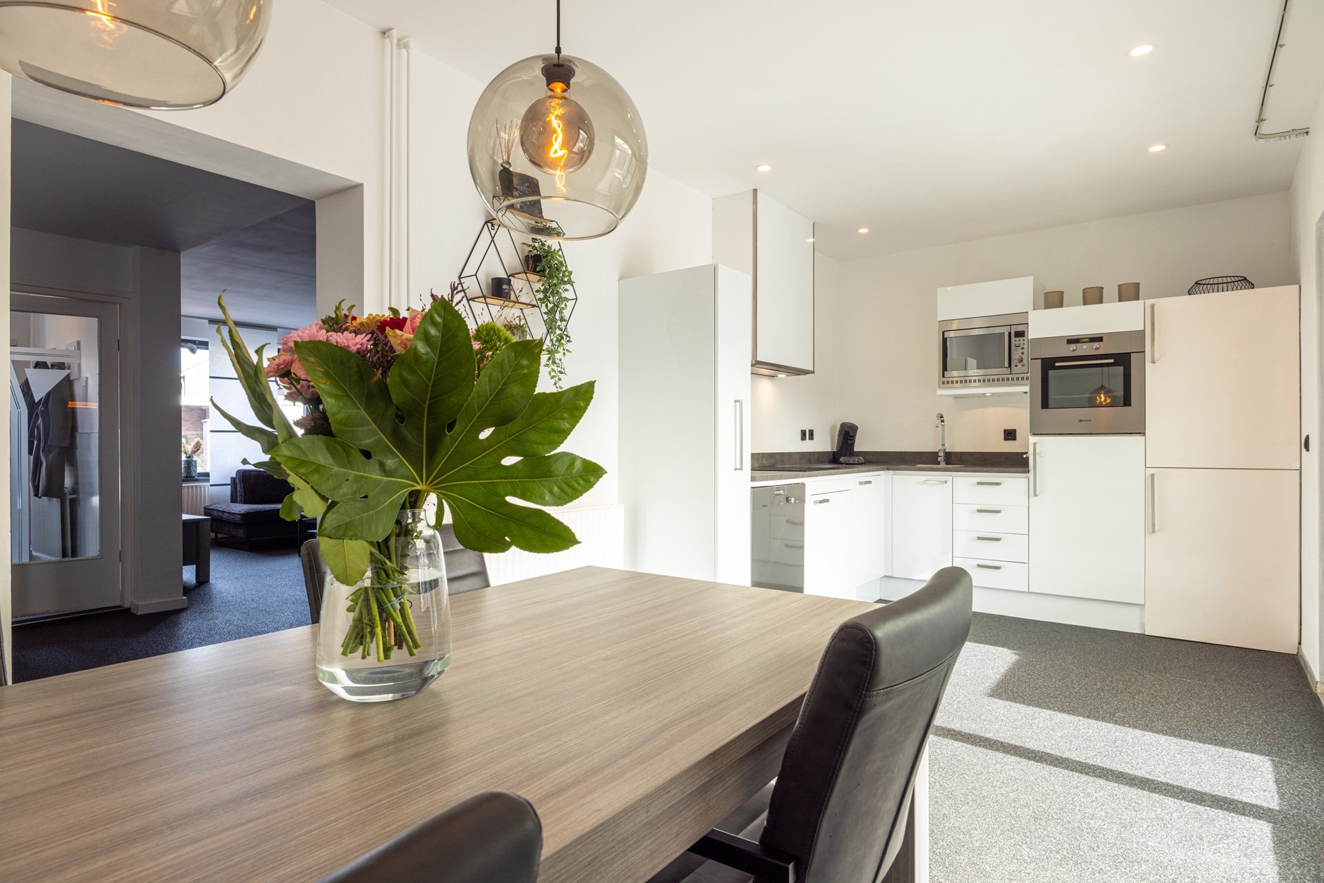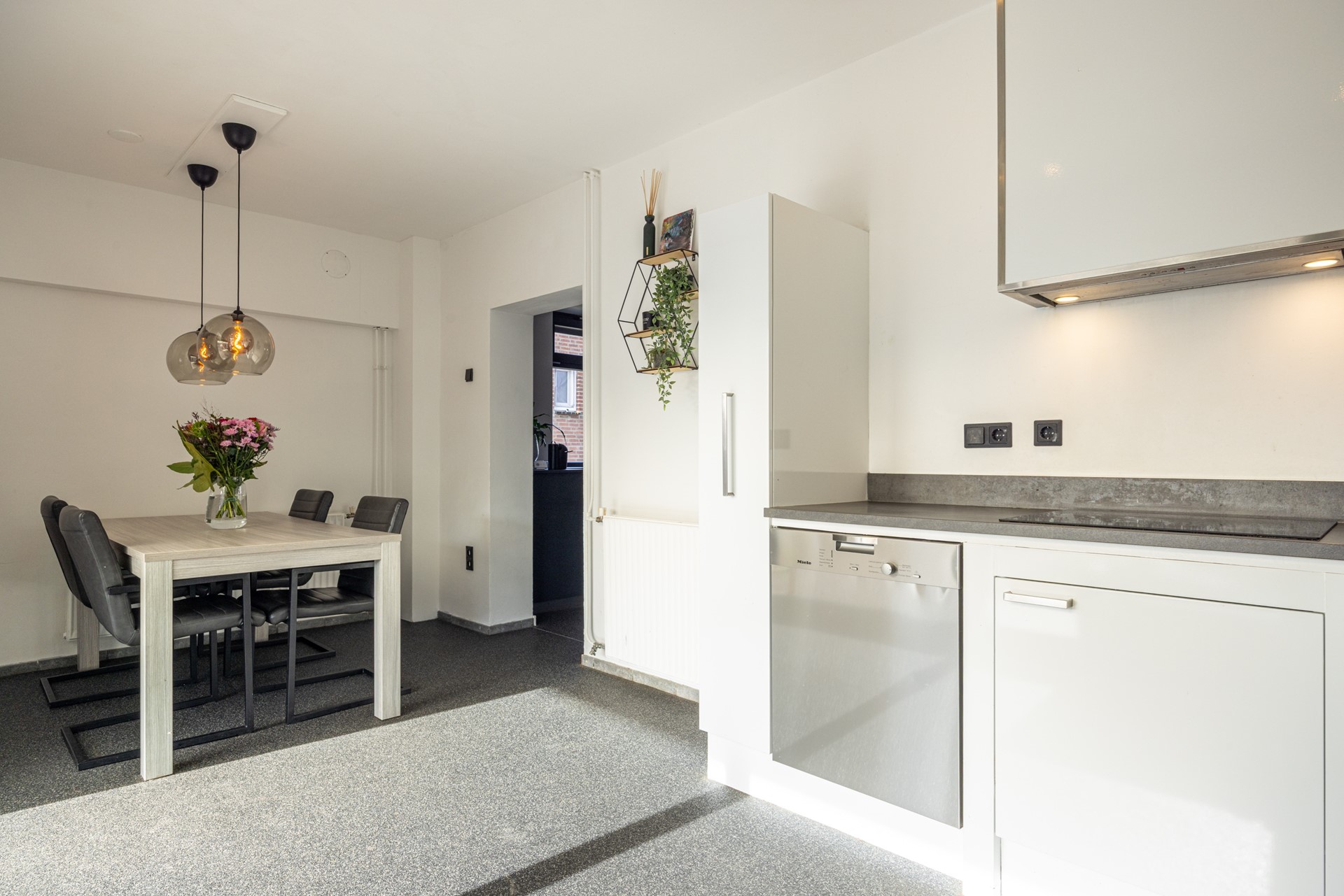 De halfopen keuken is praktisch ingedeeld met veel werk- en kastruimte. De grindvloer loopt hier mooi door. De keuken is uitgerust met: 4-pits inductiekookplaat, afzuigkap, koelkast en vaatwasser. Door de schuifpui aan de achterzijde heb je rechtstreeks toegang tot de overkapping in de tuin, waardoor binnen en buiten makkelijk in elkaar overlopen.