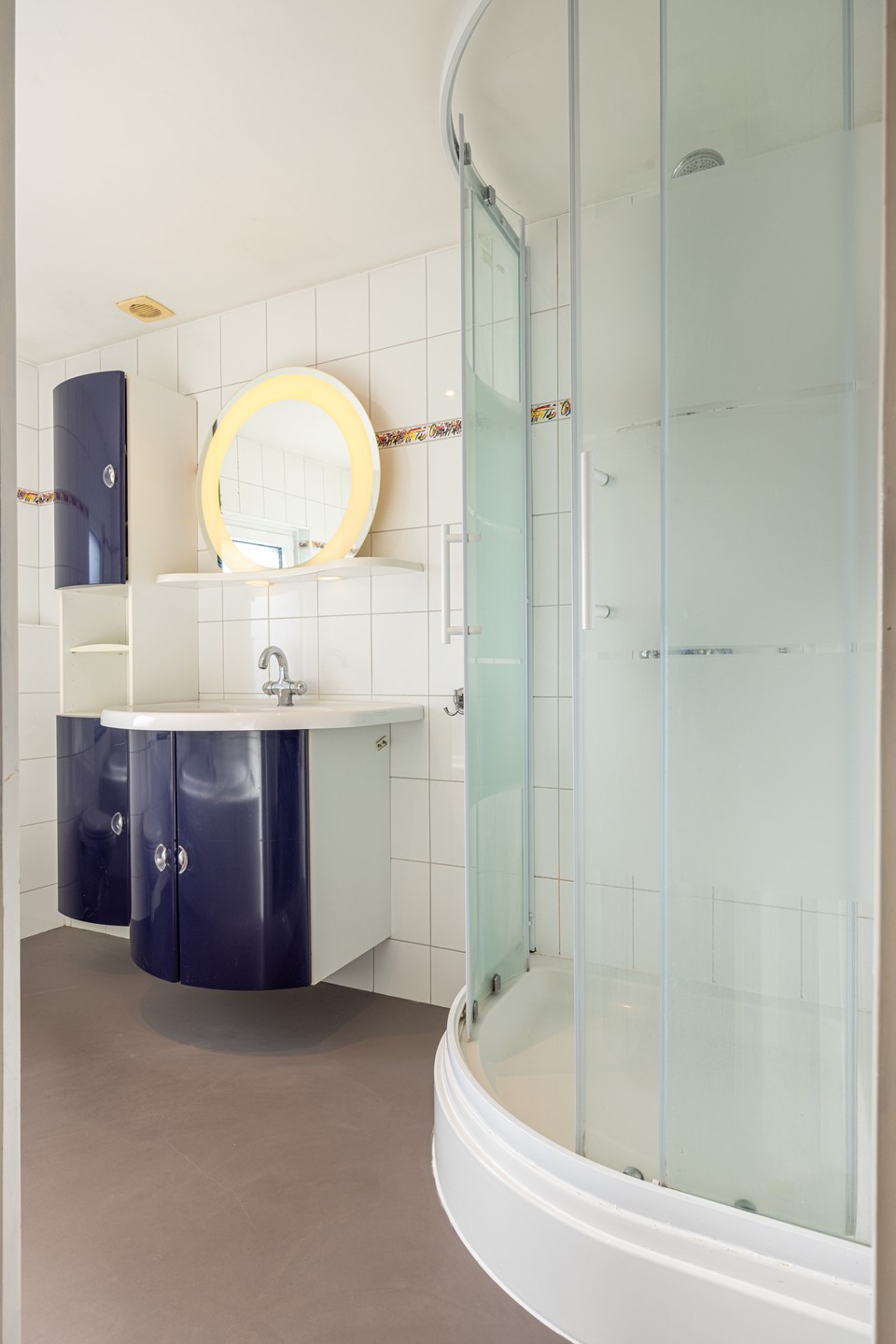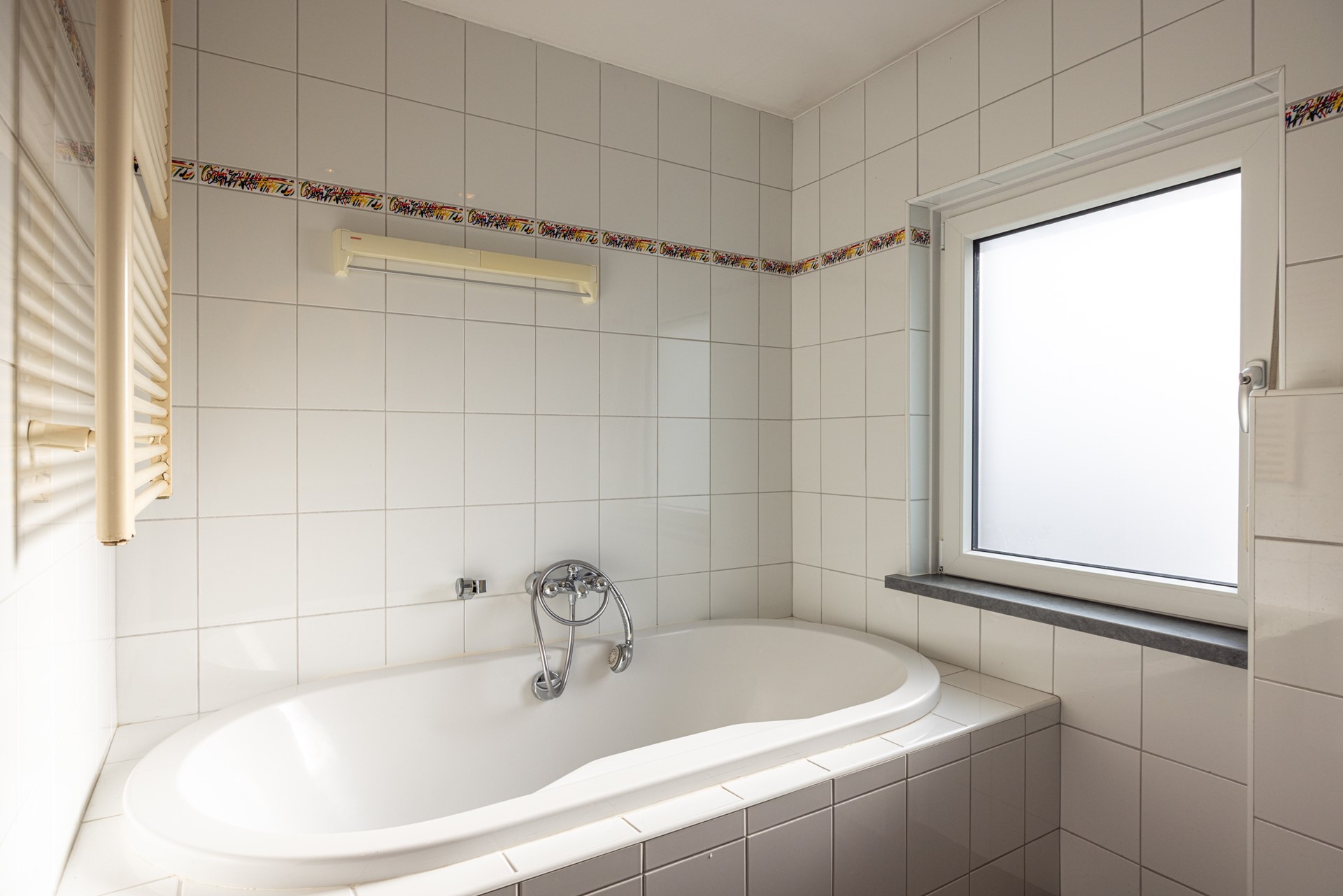 De badkamer ligt centraal op de verdieping en is uitgevoerd met een tegelvloer, een ligbad met douche, een badkamermeubel met wasbak en spiegel, een toilet en een radiator. Dankzij het aanwezige rolluik kun je de ruimte goed verduisteren en blijft het er aangenaam koel, zelfs op warme dagen.