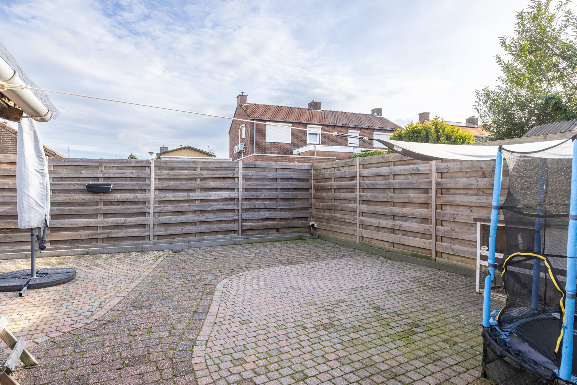 Vanuit de oprit loop je direct door naar de achtertuin, die volledig is omheind en daardoor veel privacy biedt. De tuin is betegeld, waardoor je weinig onderhoud hebt en de grote overkapping aan de woning zorgt ervoor dat je hier in elk seizoen fijn kunt zitten.